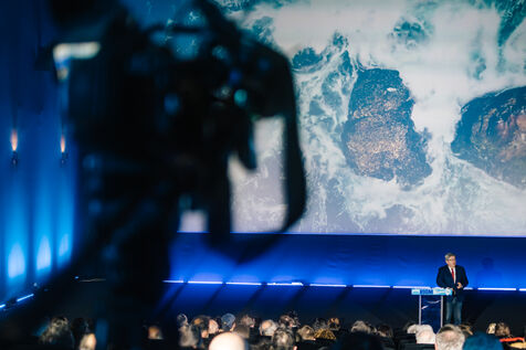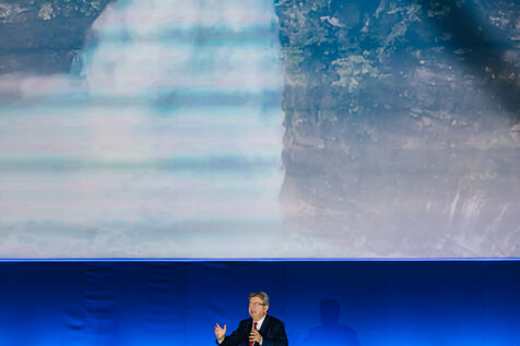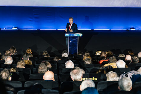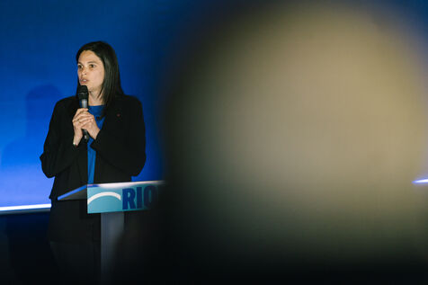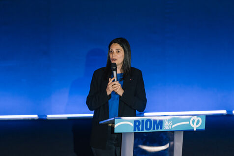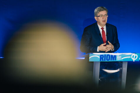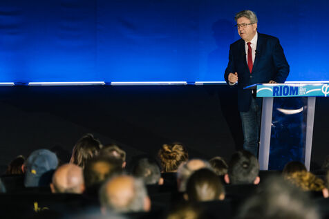 France, Riom, 2024-03-22. French left-wing party La France Insoumise (LFI) leader Jean-Luc Melenchon, and LFI MP for Puy-de-Dome department, Marianne Maximi, hold a meeting in Riom, Auvergne, near Clermont-Ferrand, on the occasion of World Water Day. Photograph by Adrien Fillon / Hans Lucas.