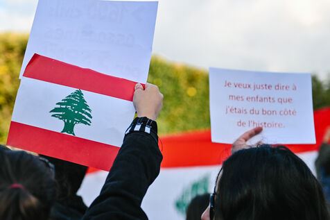France, Lille, 2024-09-28. Une petite centaine de personnes s'est réunie sur la place de la République, à Lille, le samedi 28 septembre, pour demander un cessez-le-feu au Liban, alors que le pays se fait bombarder par Israël depuis plusieurs jours. Le Hezbollah a confirmé samedi la mort de son chef, Hassan Nasrallah, dans une frappe israélienne. Photographie par Adrien Fillon / Hans Lucas.