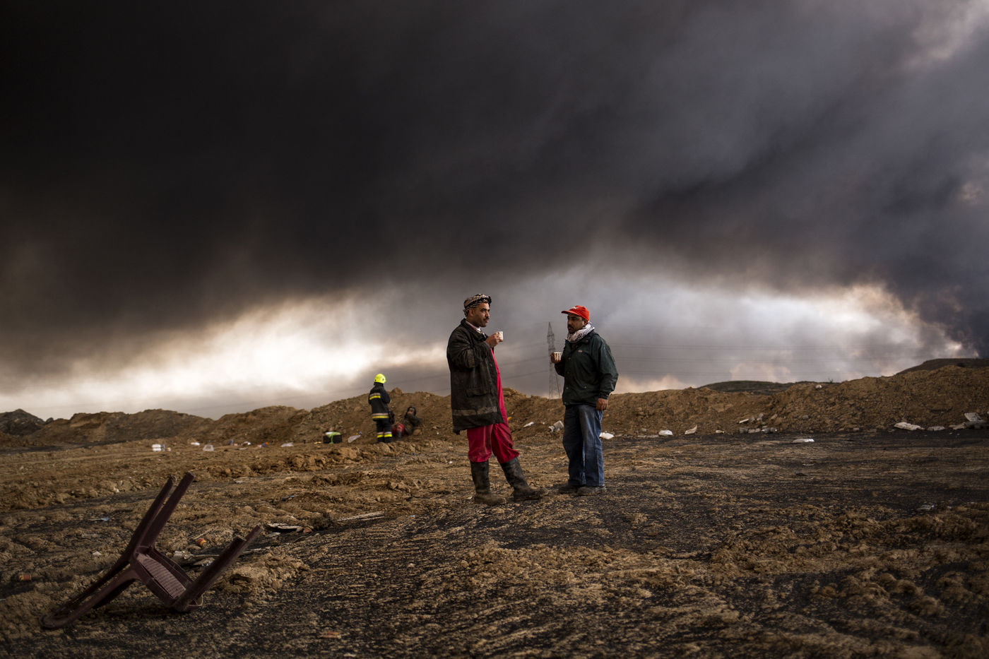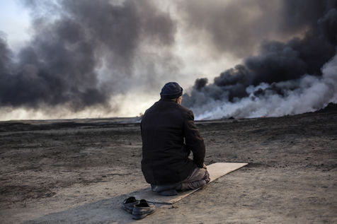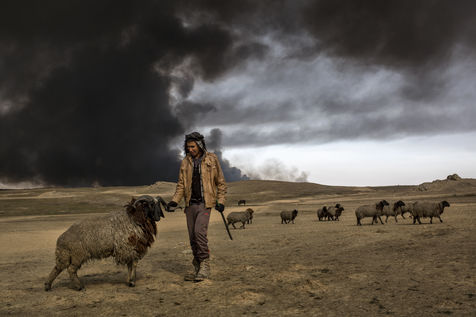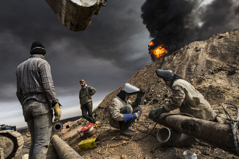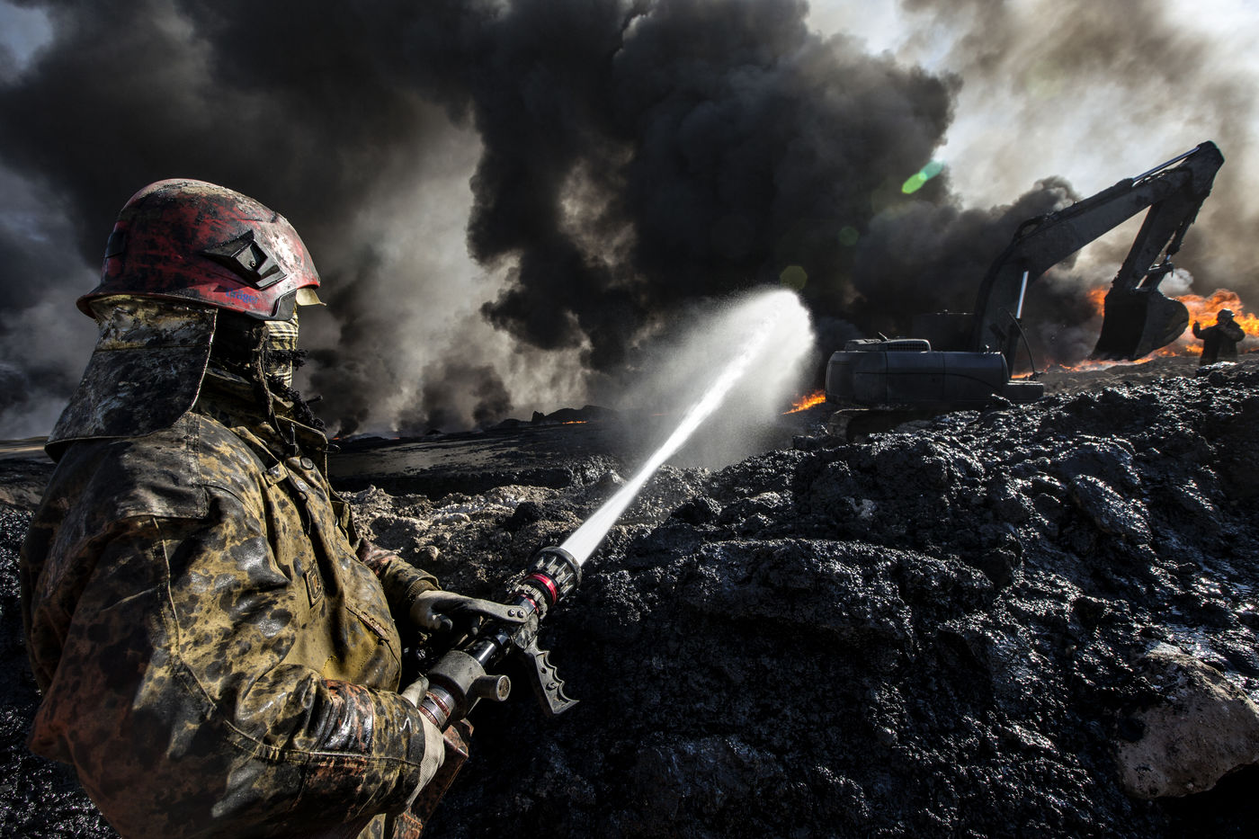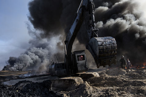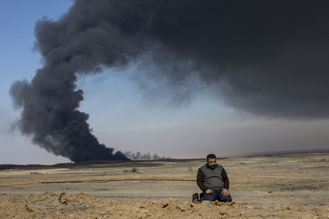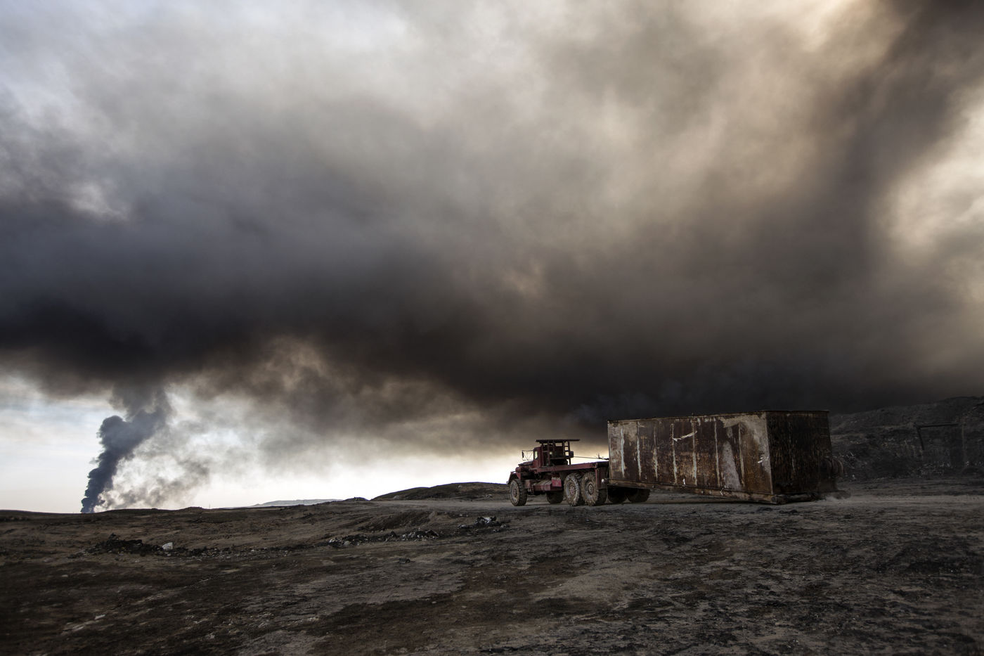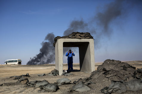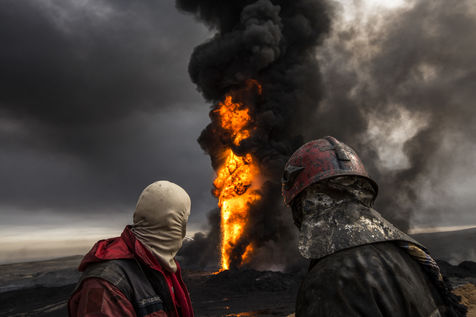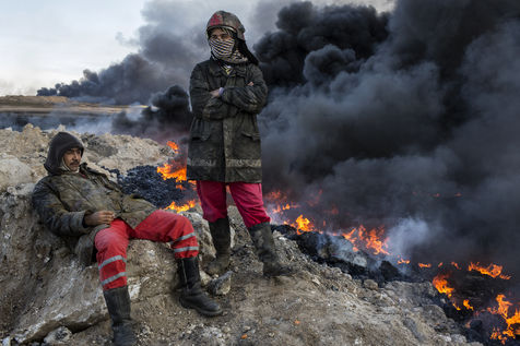 Dans leur fuite en août 2016, les hommes de Daesh ont incendié plus de vingt puits de pétrole dans la région d'Al Qayyarah, ville du Nord de l'Irak située à 70 km au sud de Mossoul. Depuis leur retraite forcée, de hautes colonnes de fumée noire et toxique s'élancent vers le ciel, assombrissant l'horizon.