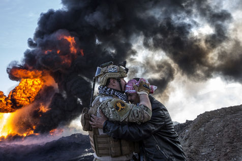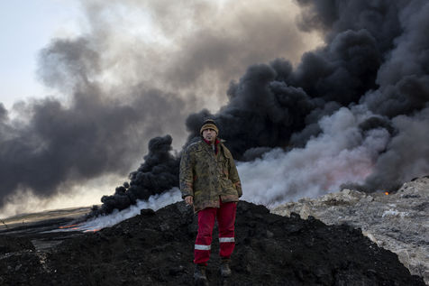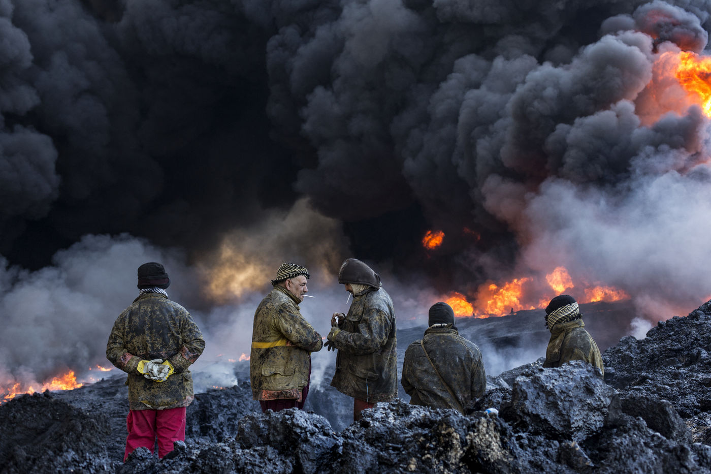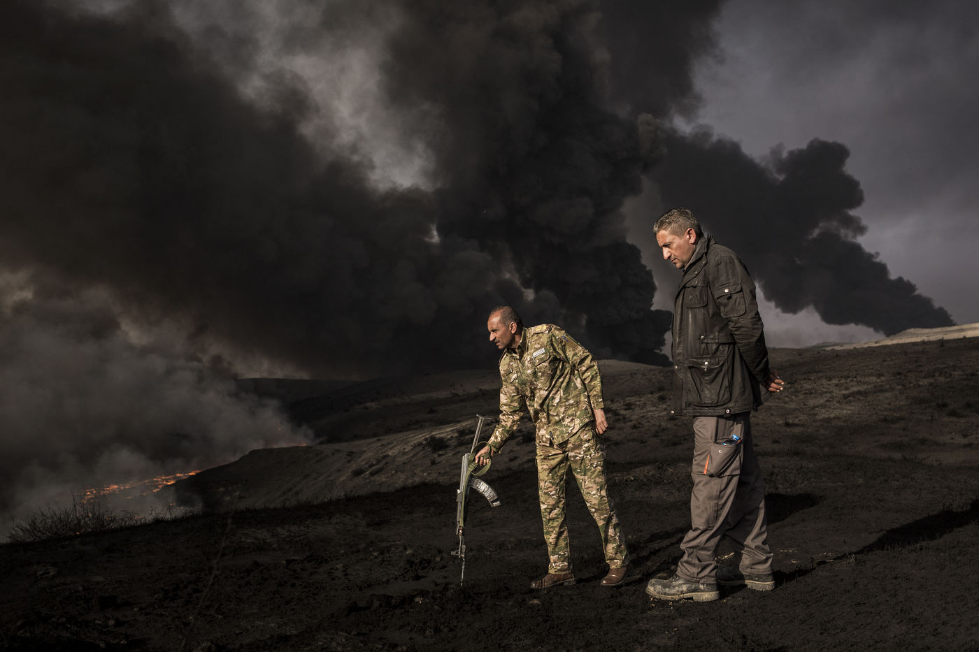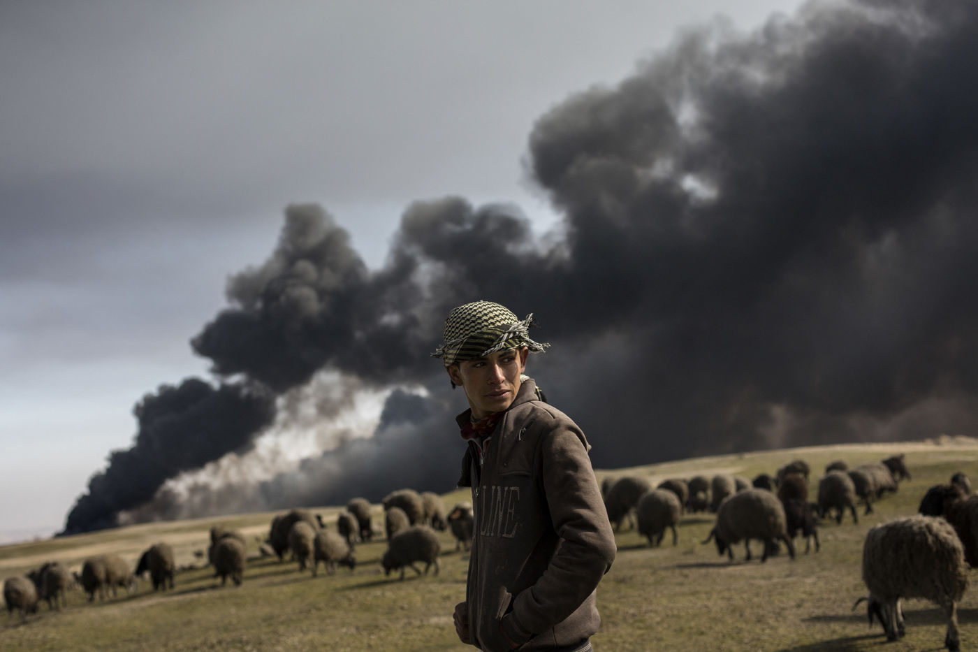 Dans leur fuite en août 2016, les hommes de Daesh ont incendié plus de vingt puits de pétrole dans la région d'Al Qayyarah, ville du Nord de l'Irak située à 70 km au sud de Mossoul. Depuis leur retraite forcée, de hautes colonnes de fumée noire et toxique s'élancent vers le ciel, assombrissant l'horizon.