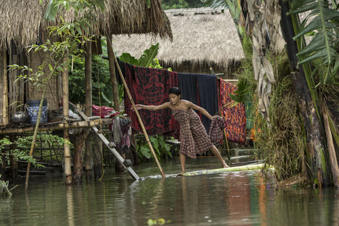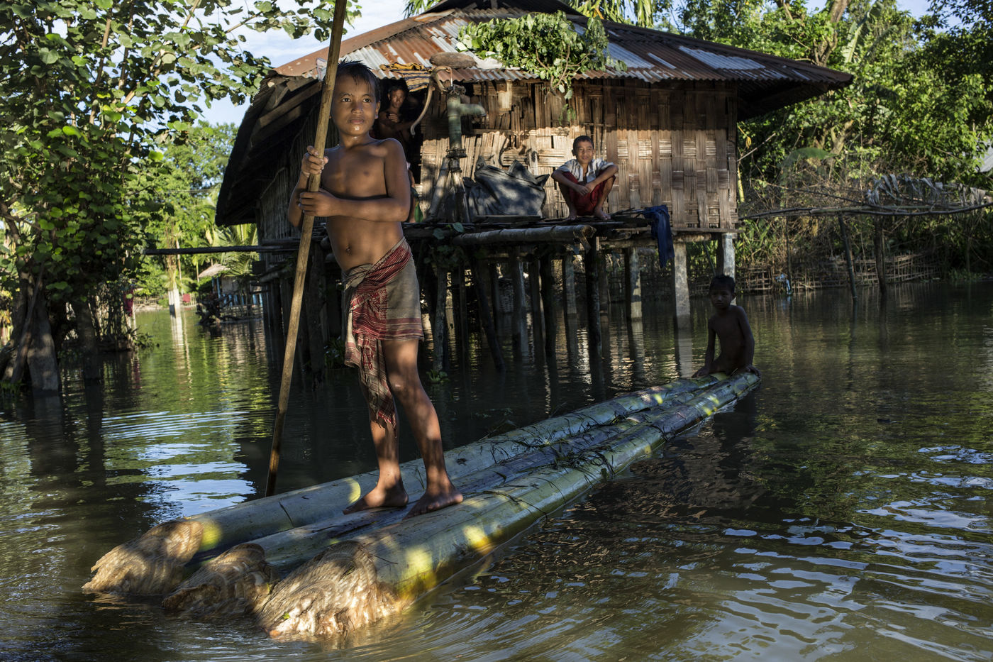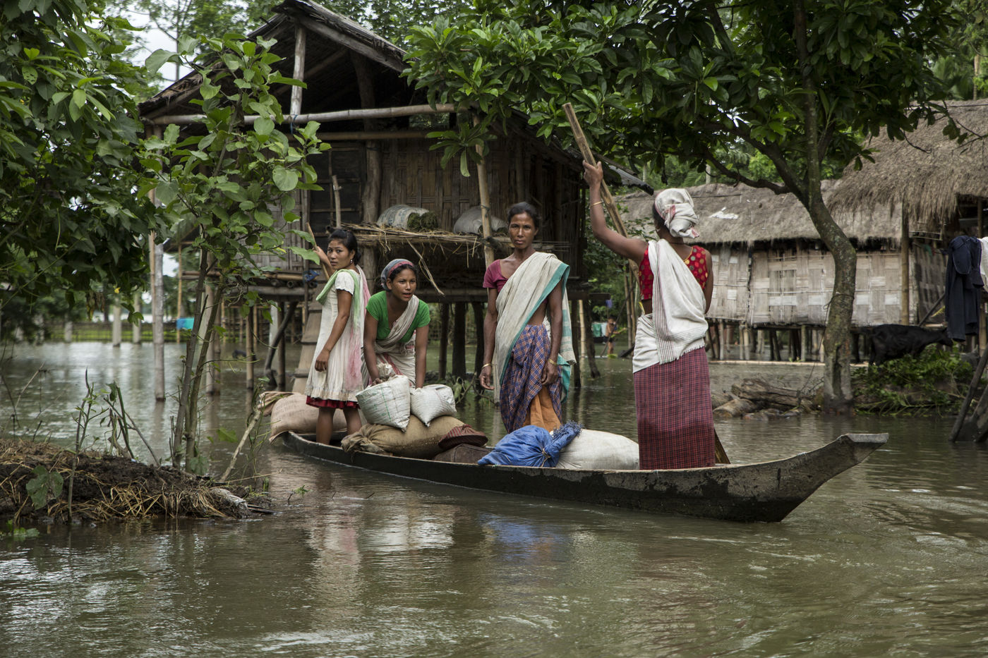 But when the torrential rains arrive, the river swells and Majuli is submerged, nibbled away on all sides. The water invades the land and destroys the crops. Its banks are torn away in whole sections. The strong currents prevent the ferry from crossing and the island is left without electricity. Every year, several villages are swept away by the floods.