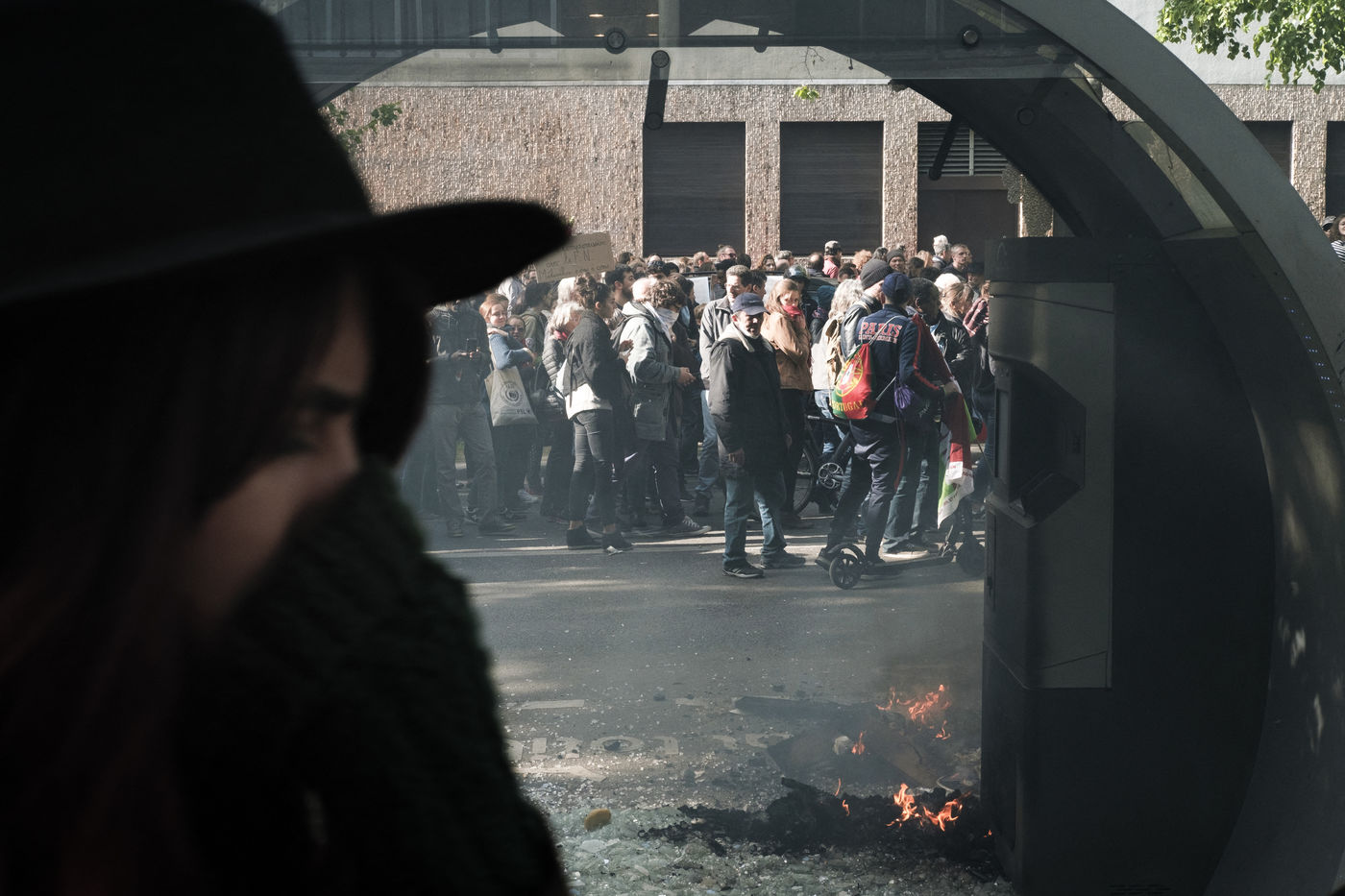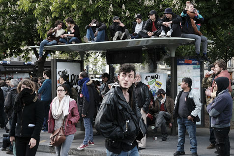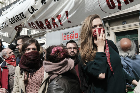Manifestation du 1er mai entre les deux tours de l'élection présidentielle française de 2017. Les manifestants sont perplexes. Les syndicats appellent à une journée de lutte et de mobilisation pour le progrès social mais n'ont pas défilé ensemble. Pour certains syndicalistes, la présence au second tour du Front National ne doit pas éclipser les revendications sociales dont l'abrogation de la loi Travail. 1er mai 2017. Paris, France.