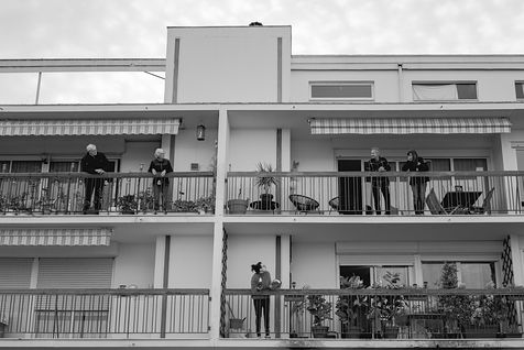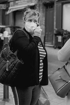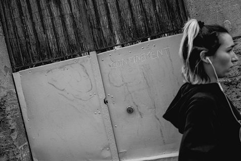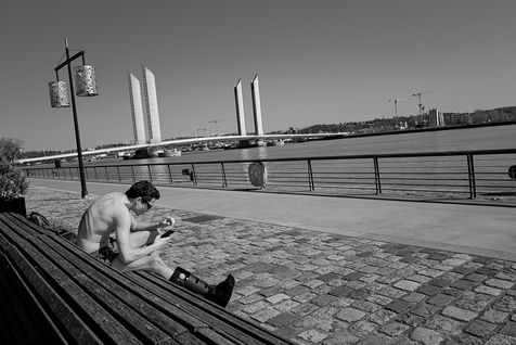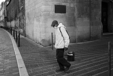 Bordeaux under lockdown. Life is slow. The people of Bordeaux are moving in a depopulated space where space-time is inexorably stretching. The fear of being contaminated sets in. The minimum distance of 1.5 metres between each person to limit contamination with Covid-19 is respected. The fear of the Covid-19, an invisible threat, is accompanied by distrust of the other. March - April 2020.