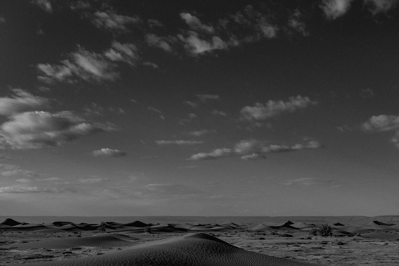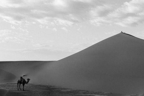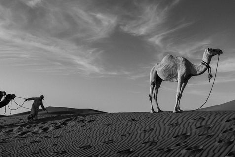 Maroc. Quelque part au sud de Zagora, des vagues de sable et le bruit du silence. Au détour d'une dune, des dromadaires et des hommes berbères.