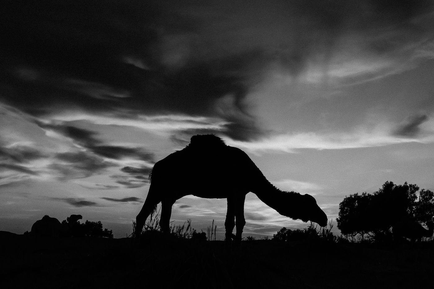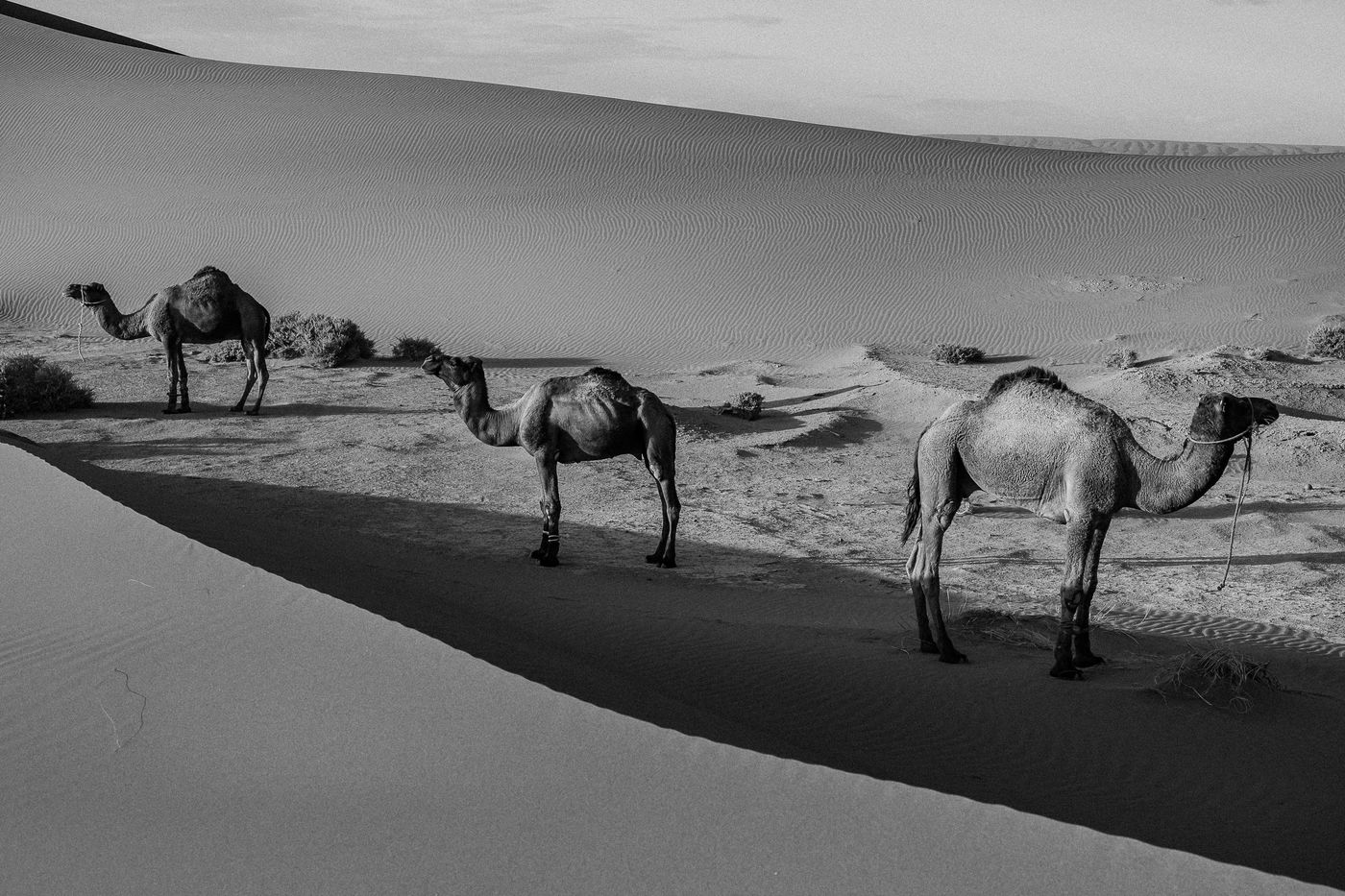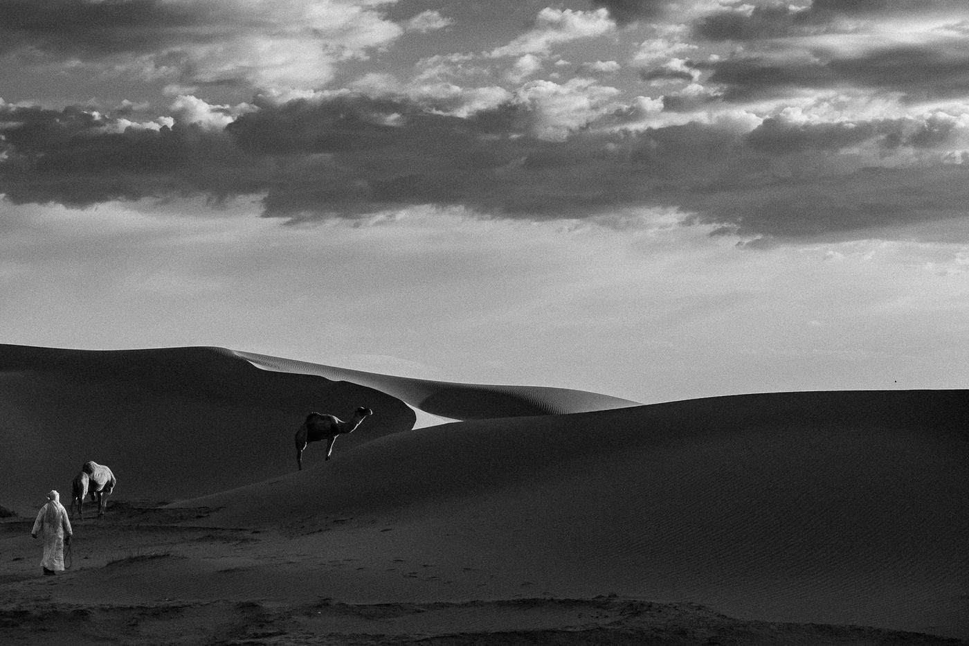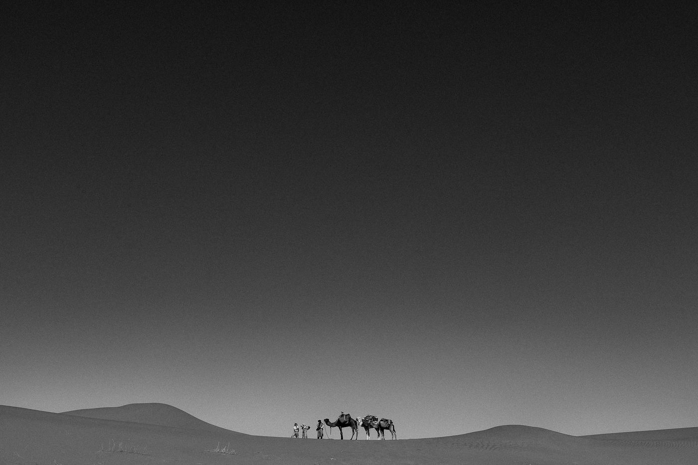 Morocco. Somewhere in the south of Zagora, waves of sand and the sound of silence. At the bend of a dune, dromedaries and Berber men.