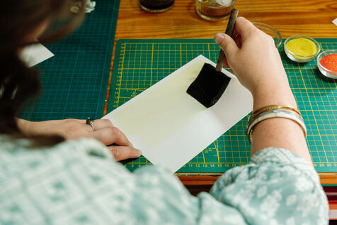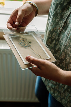 Grâce à un mélange photosensible (Citrate d'ammonium ferrique et Ferricyanure de potassium) qui est ensuite appliqué sur une surface, comme par exemple une feuille de papier, à l'aide d'un pinceau en couche homogène, Marjorie réalise des cyanotypes avec des végétaux mais également des photographies.