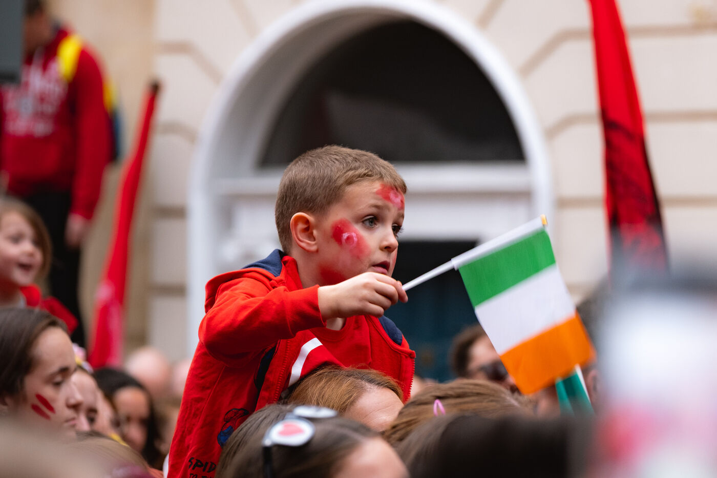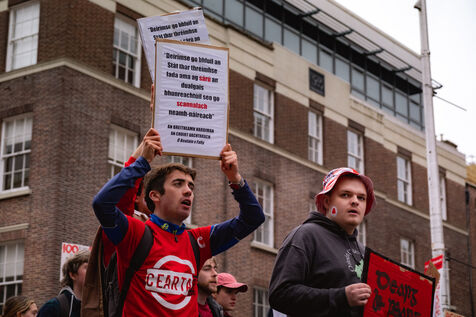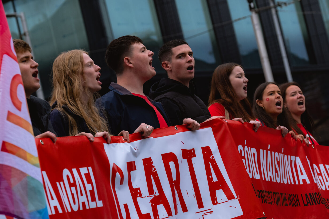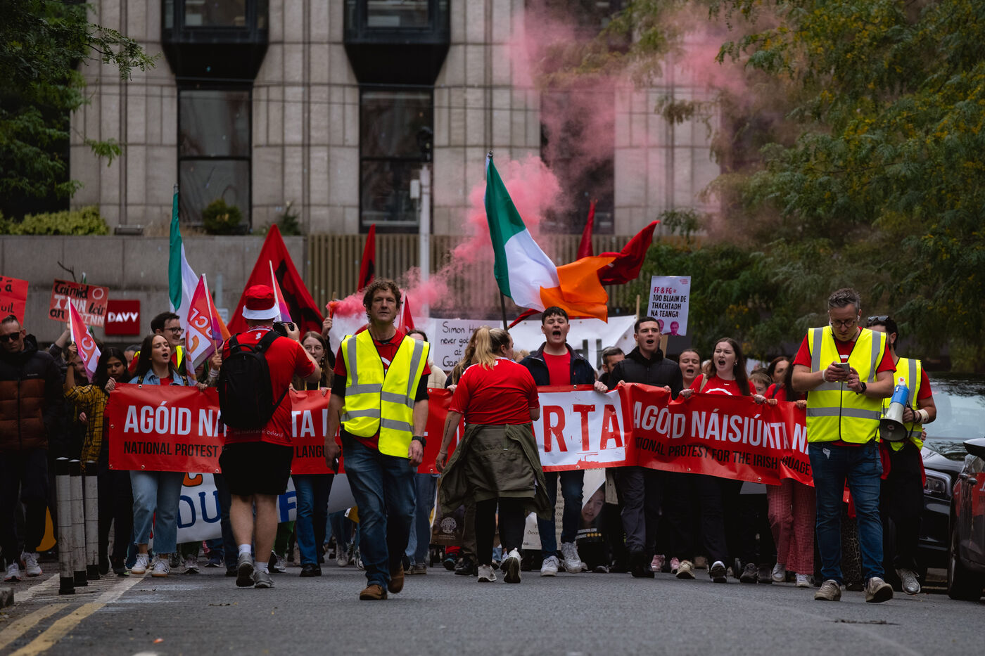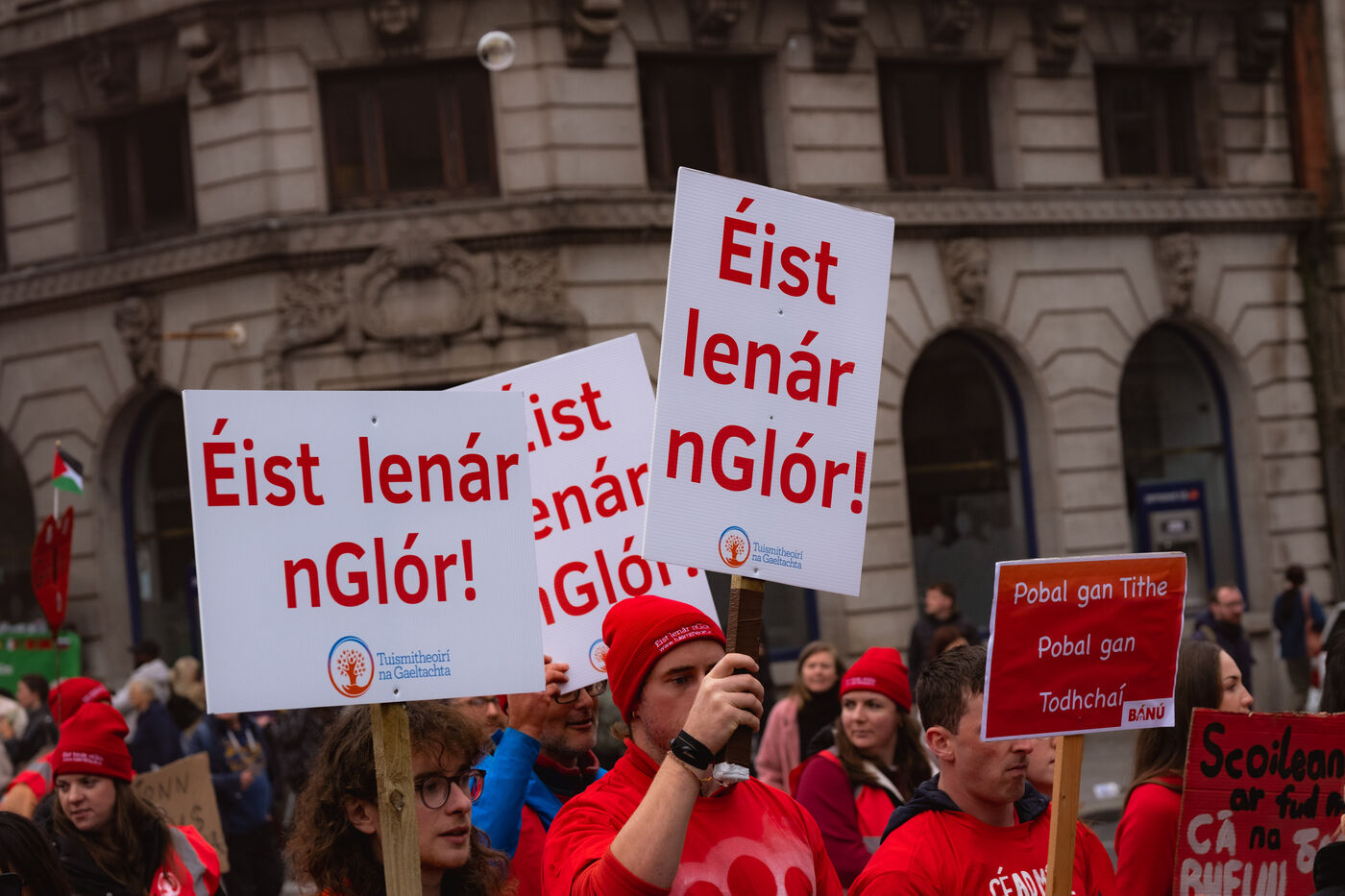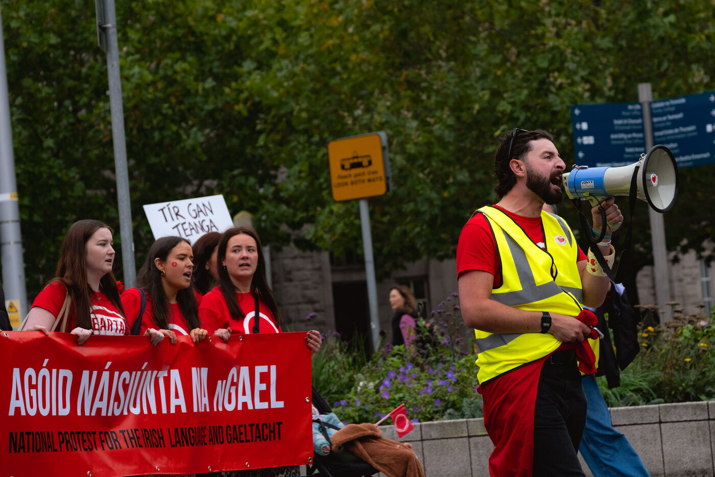 Le samedi 20 septembre 2025, des milliers de personnes ont défilé à Dublin lors de la première manifestation nationale pour la langue irlandaise et les droits du Gaeltacht (ou communauté irlandophone) depuis plus d'une décennie. Des manifestants venus de toute l'île, notamment des groupes scolaires, des organisations politiques et des communautés culturelles, se sont rassemblés de Parnell Square à Leinster House, le Parlement irlandais, vêtus de rouge, brandissant des drapeaux tricolores et scandant "Tír gan teanga, tír gan anam" ("Un pays sans langue est un pays sans âme").