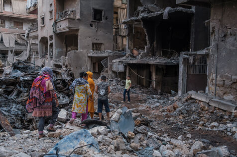 Des voisins et des habitants parcours les décombres d'un bâtiment sur le site d'une frappe israélienne qui a eu lieu sur le quartier de Basta au coeur de Beyrouth le 10 octobre 2024. Au moins 22 personnes ont été tuées lors de cette frappe, plus d’une centaine ont été blessées.