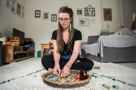 Maëva, 35, lives in the Paris region, in Bures-sur-Yvette. She is often referred to as a "perched friend" and has used her studies and her feminist commitment to find the witch in herself that she had long repressed. As a child, she made potions and watched her mother draw cards. After a traumatic draw, she abruptly gave up witchcraft, before returning to it at a turning point in her life, at the age of 27. Today, the Yin Yoga teacher links her magic to the "wild feminine" and to ecofeminism, feeling close to the Earth and as if caught up in the need to give back to women their ancestral power of healing.