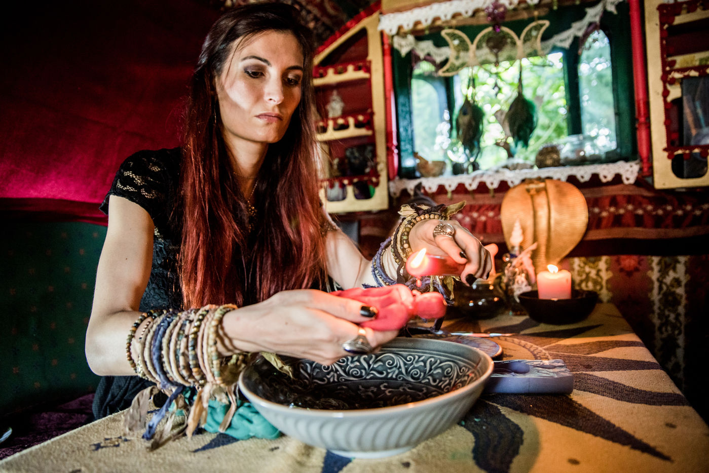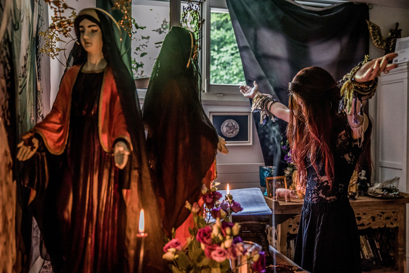 Selenya is 35 years old and lives in Geneva with her two children and her orthodontist husband. She connects with her deities for at least three hours every day, performing rituals and consultations. In her garden she has parked her caravan, in her house she has dedicated an entire room to witchcraft. According to her father, she "got it from [her] great-grandmother", a former fortune-teller.