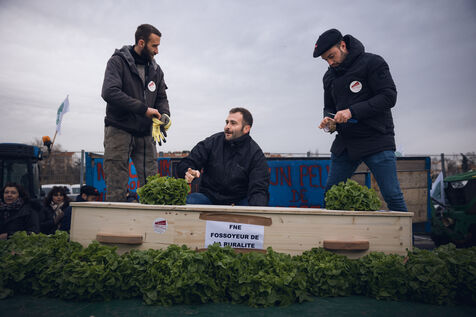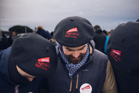 France, Perpignan, 2023-01-24. Illustration, Farmers from the Pyrenees-Orientales gathered in unions (FNSEA, Jeunes Agriculteurs) demonstrated alongside many local elected officials this Tuesday, January 24 in the streets of Perpignan. The Pyrenees-Orientales are in the front line of a historic winter drought and the restrictions are still there. For the first time, the issue lingers in the courts over a dispute between the prefecture of Perpignan, France Nature Environnement and farmers. The Administrative Court of Montpellier ruled in favor of the association France Nature Environnement on November 29, 2022. Photograph by Arnaud Le Vu / Hans Lucas.