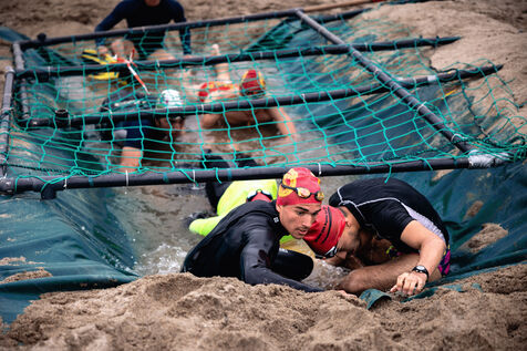 France, Argeles-sur-Mer, 2023-04-28. The candidates for the position of lifeguard on the beach of Argeles-sur-Mer participate on the last day of the course to the test of Koh-lanta to test their physical condition and their team cohesion. Photograph by Arnaud Le Vu / Hans Lucas.