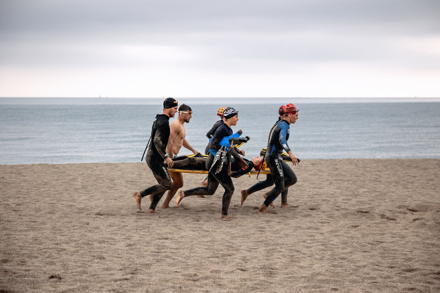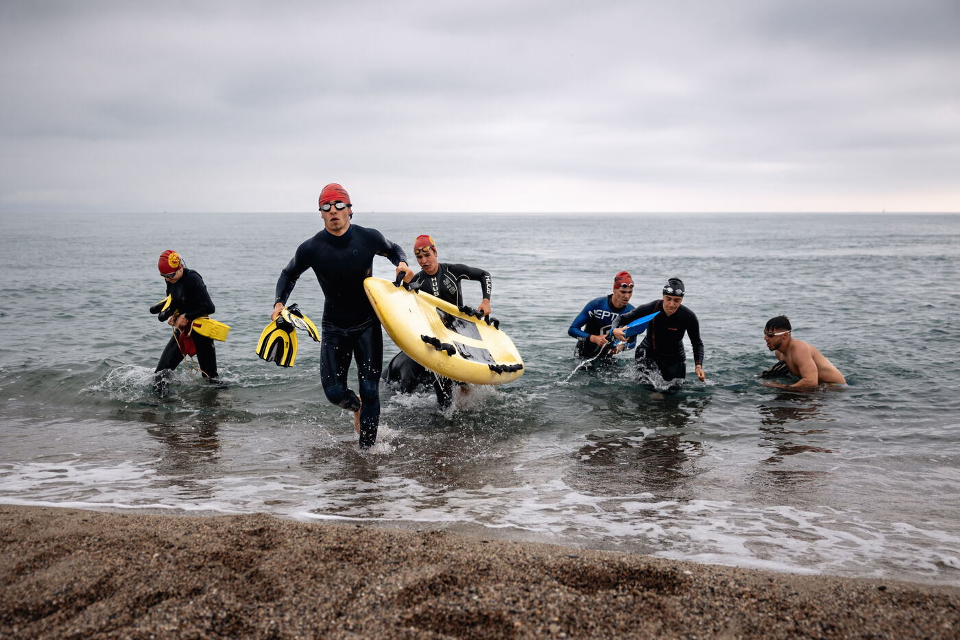 France, Argelès-sur-Mer, 2023-04-28. Les candidats au poste de nageur sauveteur sur la plage d'Argelès-sur-Mer participent le dernier jour du stage à l'épreuve du Koh-lanta pour tester leur condition physique et leur cohésion d equipe. Photographie de Arnaud Le Vu / Hans Lucas.