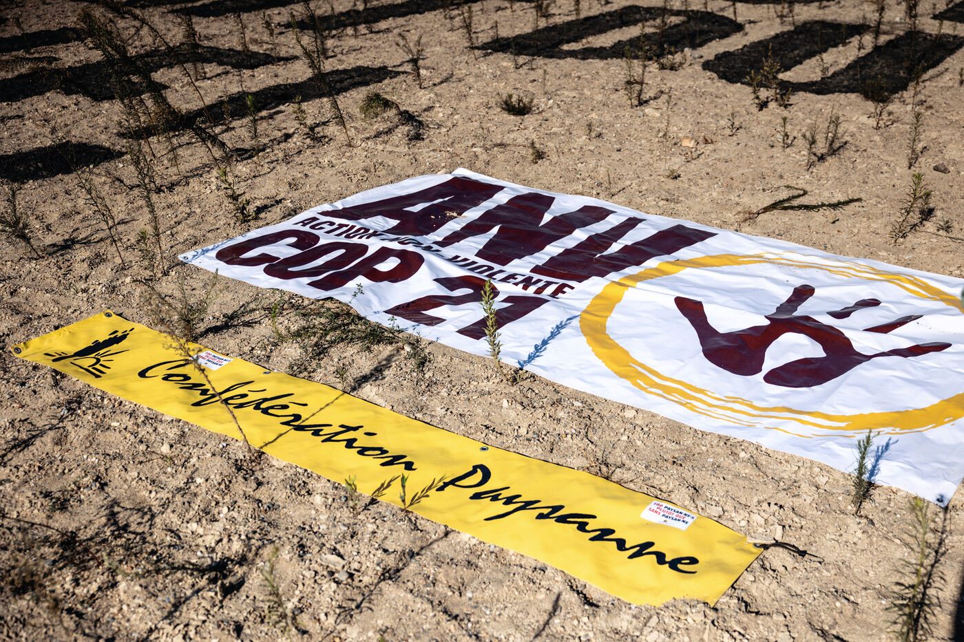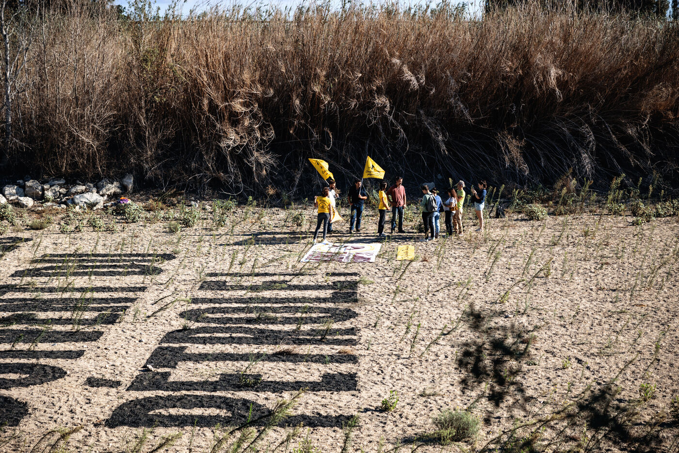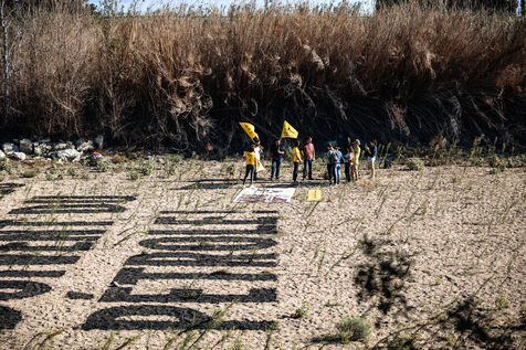 France, Claira, 2023-08-31. « Ils n'ont pas d'eau ? Qu?ils boivent du pétrole ». Il a fallu trois jours aux Militants écologistes ANV-COP21 et aux agriculteurs de la Confédération paysanne des Pyrénées-Orientales pour inscrire cette fresque dans le lit asséché de l'Agly. Un message à l'encontre de Total Énergies. Par cette action, les activistes souhaitent «dessiner un lien direct entre les gros pollueurs et la situation de sécheresse historique que vivent les Pyrénées-Orientales et au-delà.»