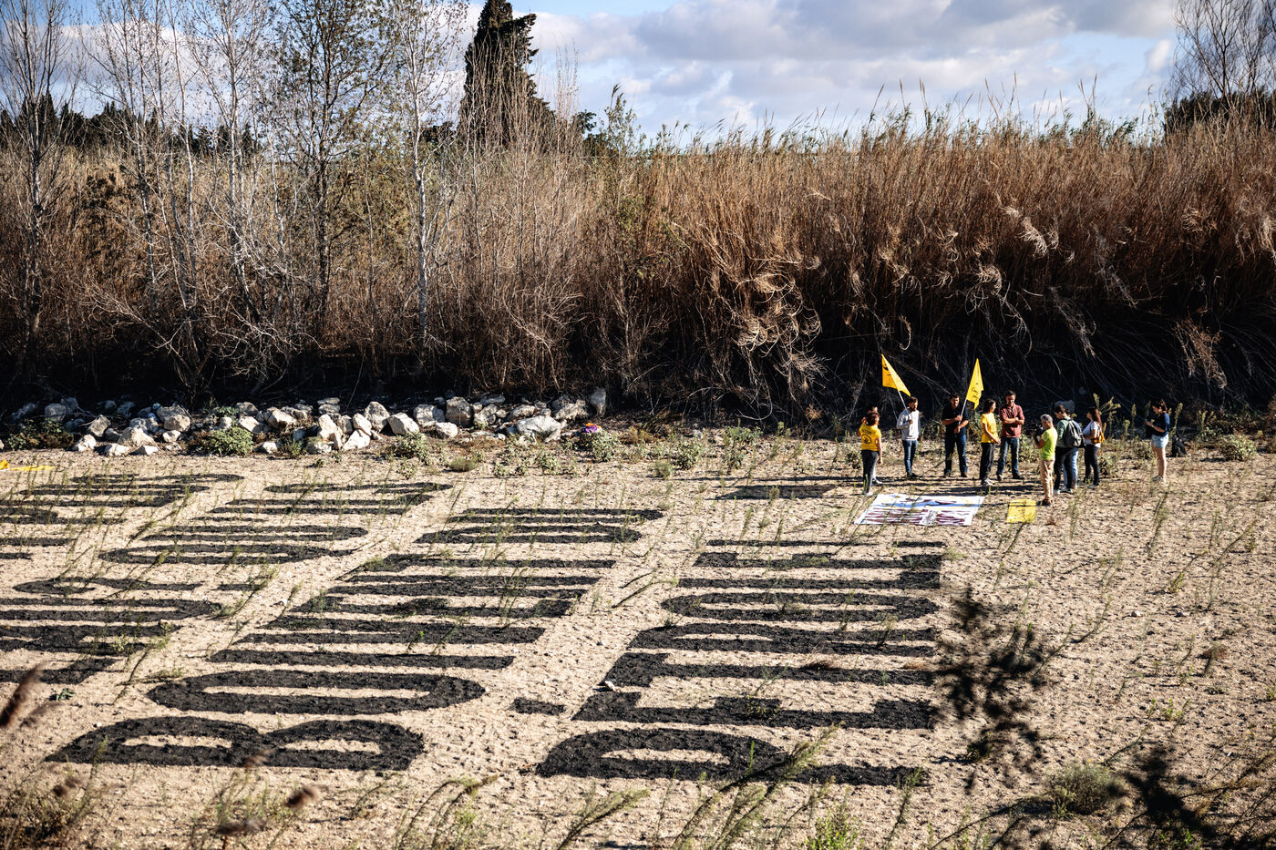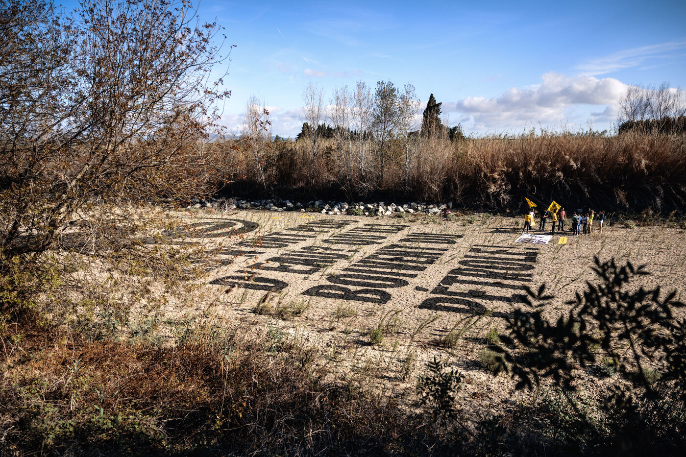 France, Claira, 2023-08-31. "Don't they have water? Let them drink oil". It took environmental activists ANV-COP21 and farmers from the Confédération paysanne des Pyrénées-Orientales three days to paint this fresco in the dry bed of the Agly. A message against Total Energies. Through this action, the activists hope to "draw a direct link between the big polluters and the situation of historic drought that the Pyrénées-Orientales and beyond are experiencing".