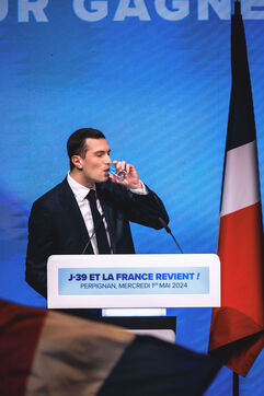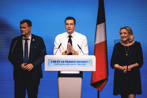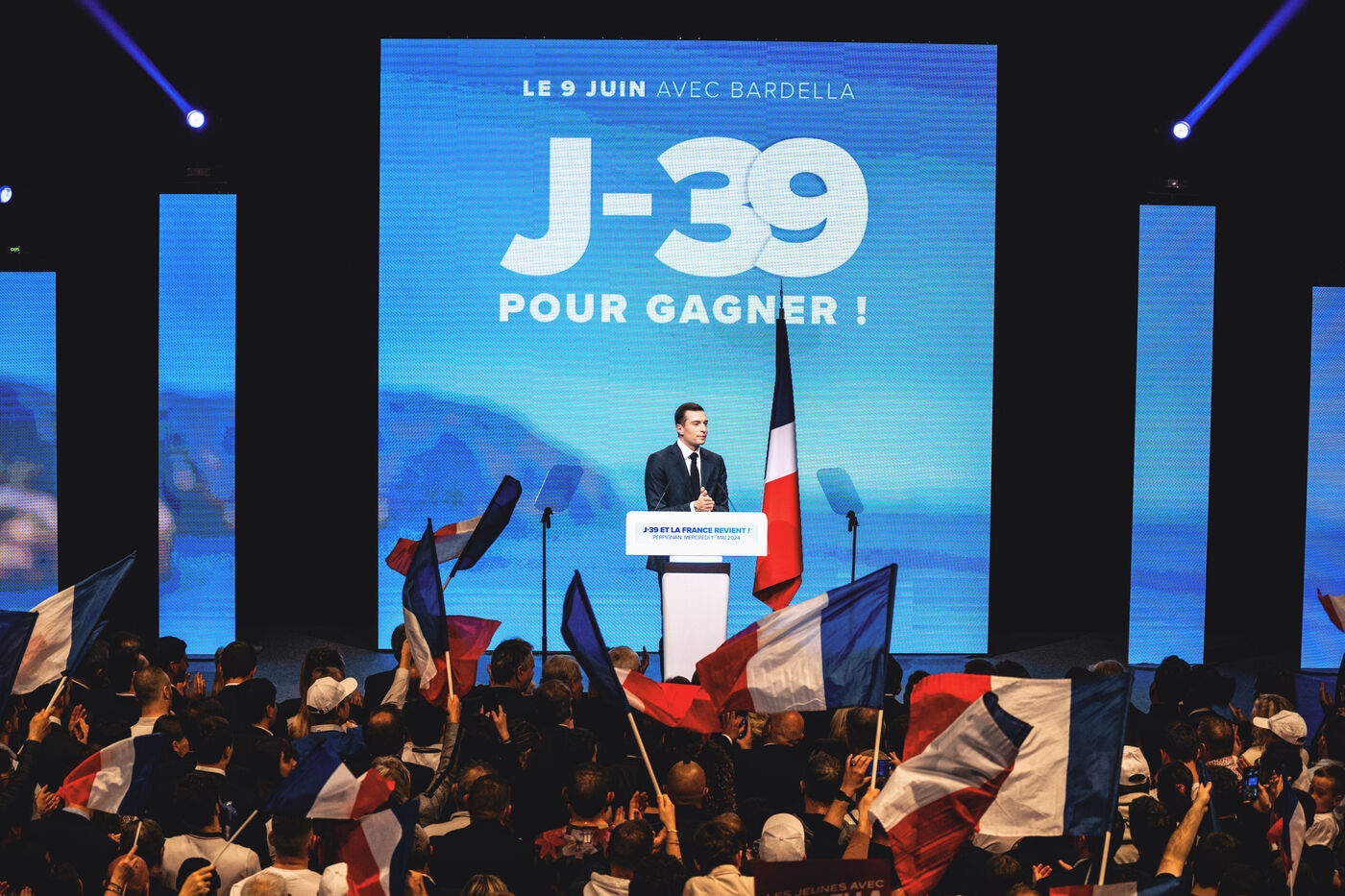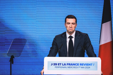 Rassemblement National meeting at the Palais des Congres in Perpignan in the French department of Pyrenees-Orientales on May 1, 2024. As part of the 2024 European elections campaign, Jordan Bardella, current Member of the European Parliament and lead candidate, unveiled his running mates.