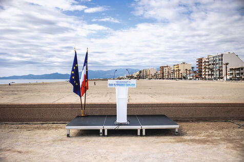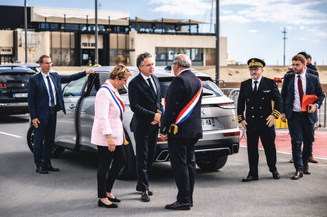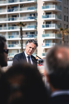 Déplacement du ministre Christophe Béchu à Canet-en-Roussillon dans le département français des Pyrénées-Orientales le 22 mai 2024. Christophe Béchu a présenté son Plan de résilience pour l'eau, qui se compose de sept projets structurants, et a annoncé une enveloppe de 10 millions d'euros pour le département.