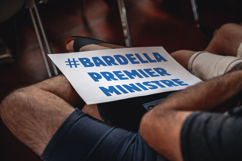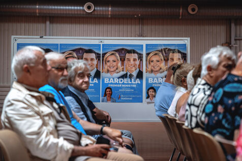 A Rassemblement National meeting at the Espace Saint Mamet in Saint Esteve in the Pyrenees-Orientales department of France on July 3, 2024. The outgoing deputies and party elected officials in the department motivated members for the final stretch before the second round of legislative elections.