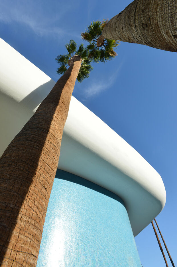 De West Cielo Road, la vue sur la ville de Palm Spring est de toute beauté. Une mer de palmiers crée la réalité d’une oasis qui s’étend loin dans le désert. Le paysagiste Paul Ortega travaille ici sur le jardin d’une maison des années 50, blanche, aux lignes épurées se perdant dans les rochers.