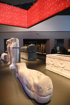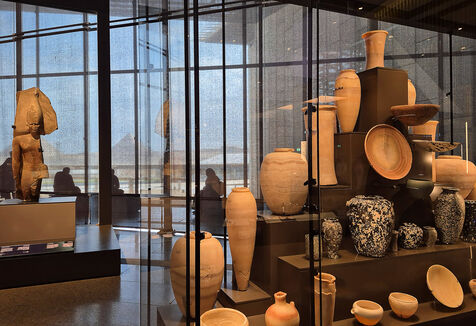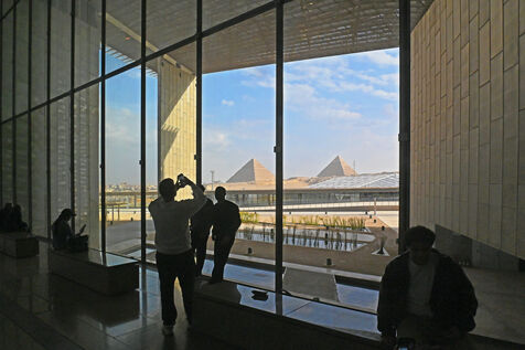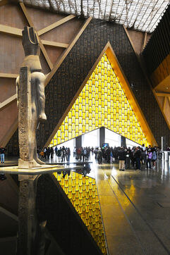 At the top of the grand staircase, a large bay window allows you to admire the pyramids of Giza, located less than three kilometers from the museum. In order not to obscure their view, the Grand Museum, designed by the Heneghan-Peng architectural firm, is located below the pyramids. The cost of the work, estimated at $550 million, ultimately exceeded $1 billion. The museum is designed to make the link between the Nile, symbol of life and fertility, and the Giza plateau, place of residence of the deads. Oriented towards the pyramids, it takes their triangle shape as shown in with the main entrance decorated with 25 cartridges representing the names of the 25 pharaohs of Egypt.