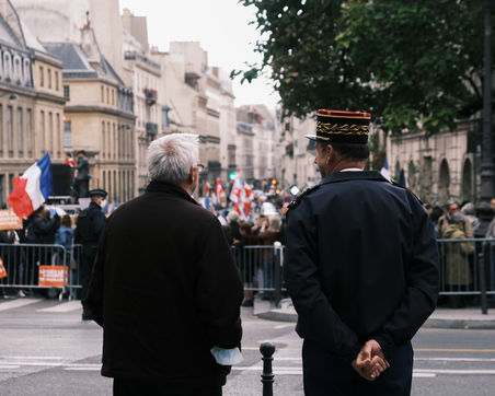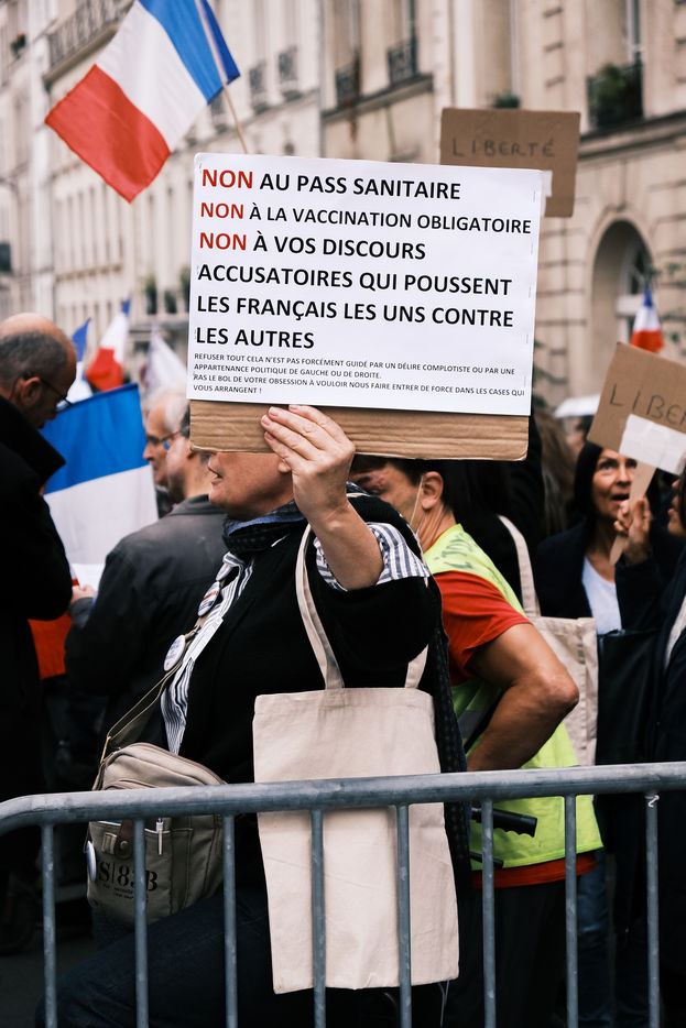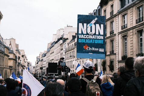 Manifestation contre la loi sur l'obligation vaccinale à Paris. À l'appel de Florian Philippot, fondateur du mouvement d'extrême droite "les Patriotes", la manifestation prend place devant le Sénat, à la veille de l'étude du texte de loi au Conseil des ministres.