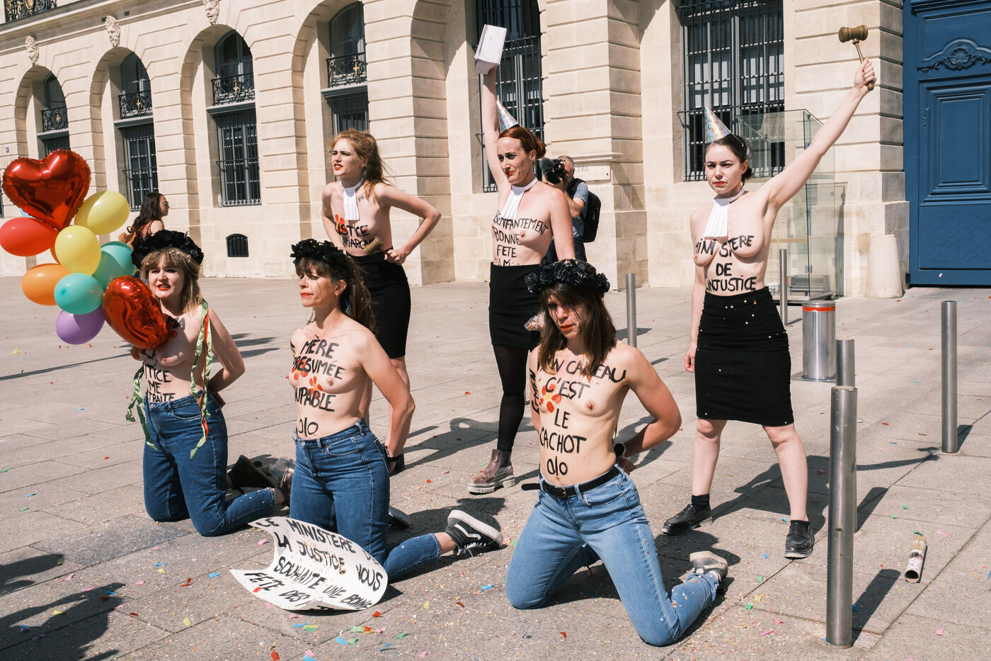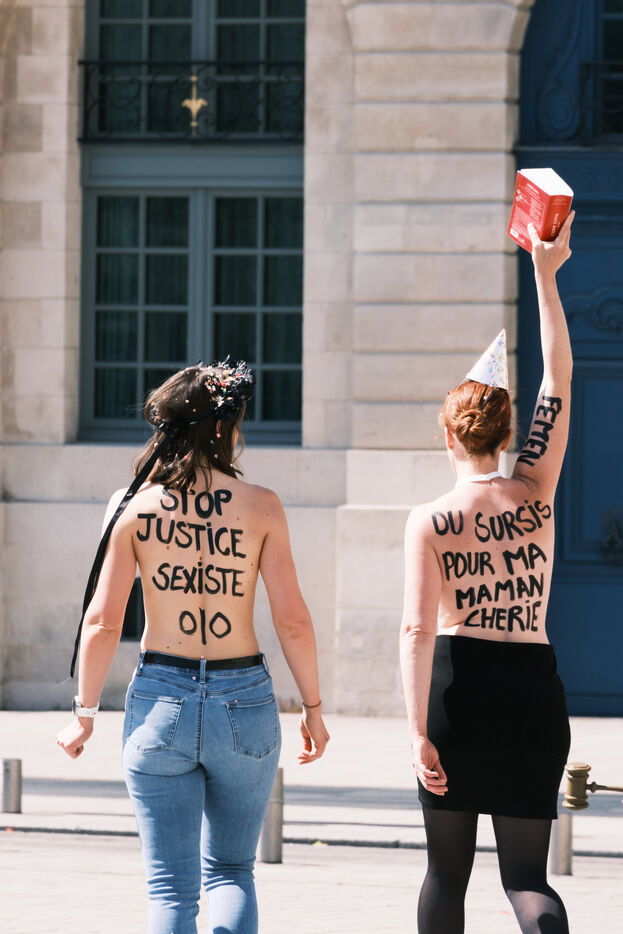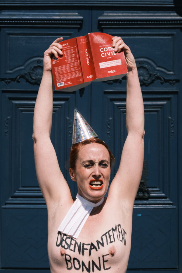 Action by the Femen feminist collective in front of the Ministry of Justice on Mother's Day, to denounce the justice system's inaction on domestic violence and support the protective mothers incarcerated for wanting to protect their children from a violent father.