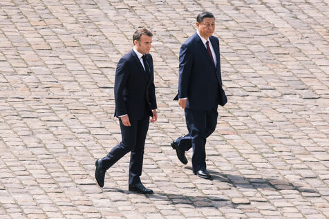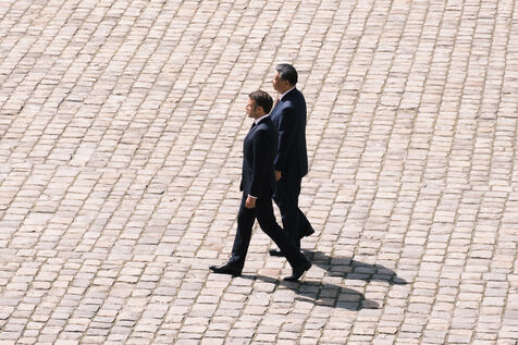 President Emmanuel Macron welcomes Xi Jinping, President of the People's Republic of China, on his official visit to France, at a welcoming ceremony in the courtyard of the Hôtel National des Invalides.