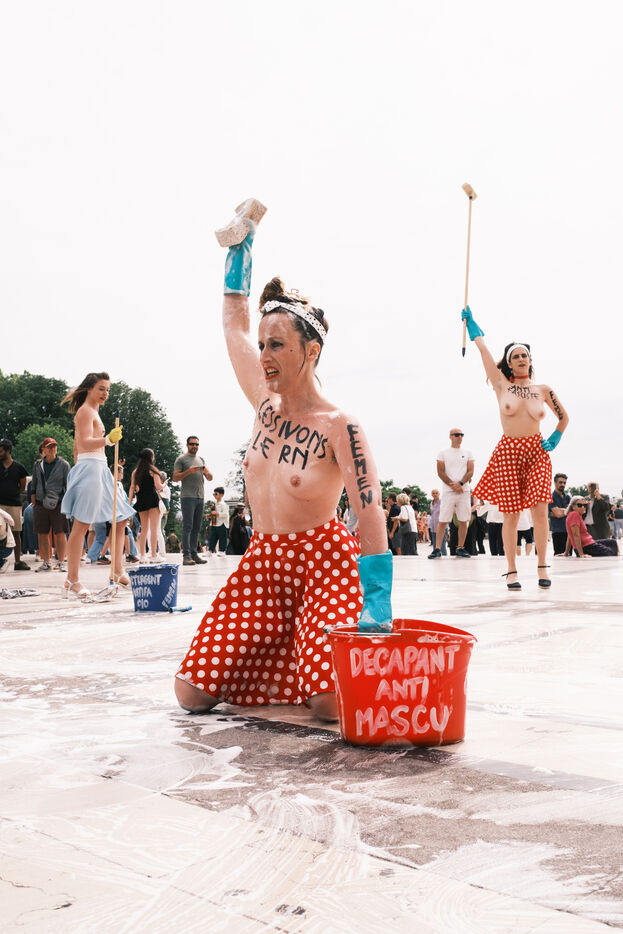 Action du collectif féministe Femen, pour appeler à faire barage à l'extrême droite, à la veille des élections législatives. Sur le parvis des Droits de l'Homme, les militantes mettent en scène un "nettoyage antifasciste contre le RN".