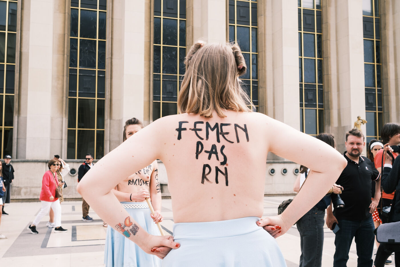 Action by the Femen feminist collective, to call for a barrage against the extreme right, on the eve of the legislative elections. On the parvis des Droits de l'Homme, the activists staged an "anti-fascist cleansing against the RN".