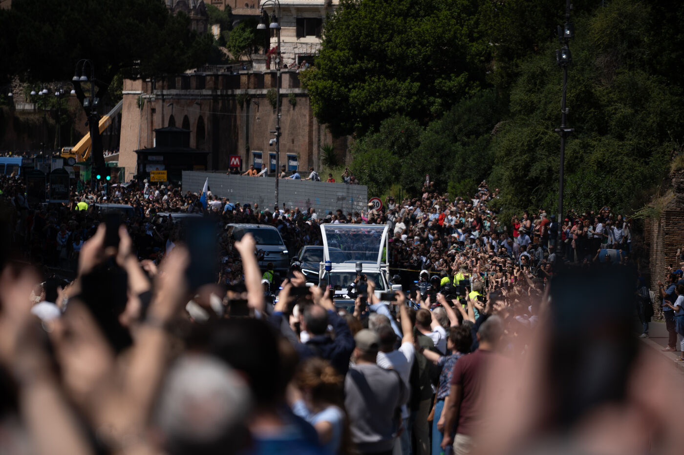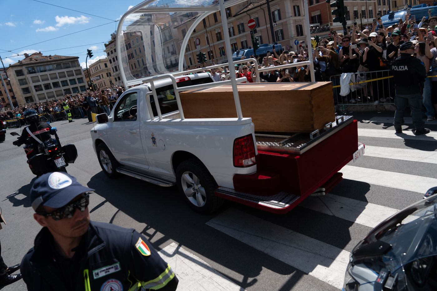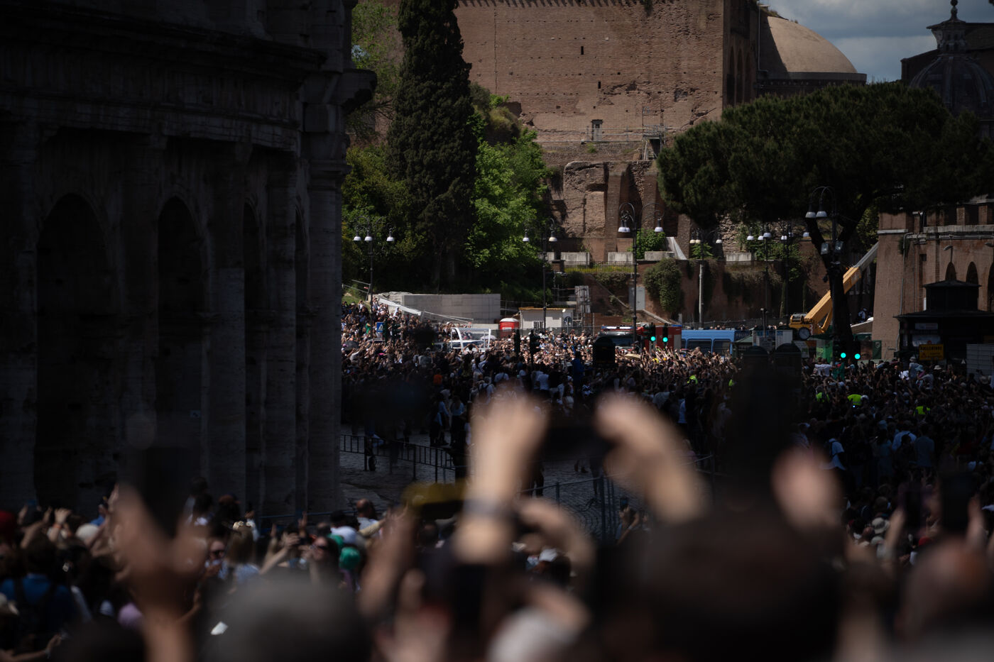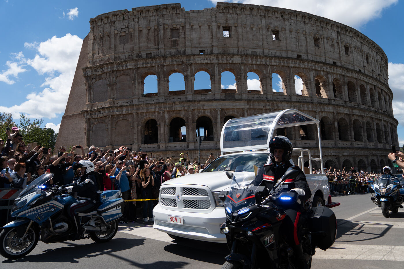 The papamoblie with the coffin of Pope Francis passes in front of the Coliseum. Hundreds of faithful and tourists bid him a final farewell.