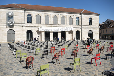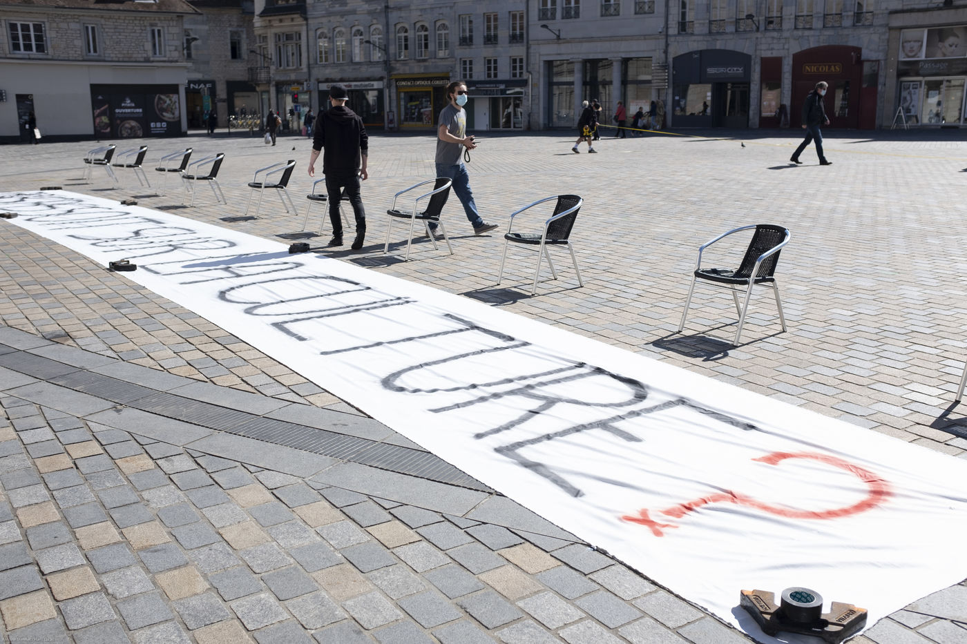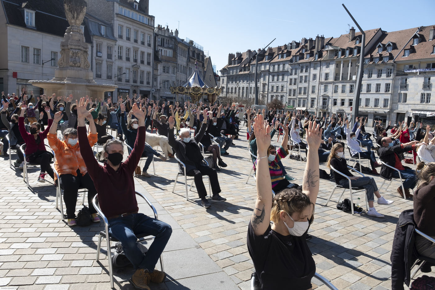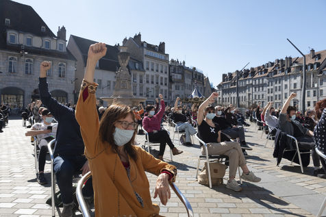 Every day at 2pm an agora is held in front of the theatre. Multiple actions have already taken place. After the installation of numerous banners throughout the city, a large festive and protest rally on 21 March at the Cité des Arts, the CIP FC (Coordination de Intermittents et Précaires de Franche Comté), the DNMADE section of the Pasteur high school and the CGT spectacle organised a flash action at the Place de la Révolution.