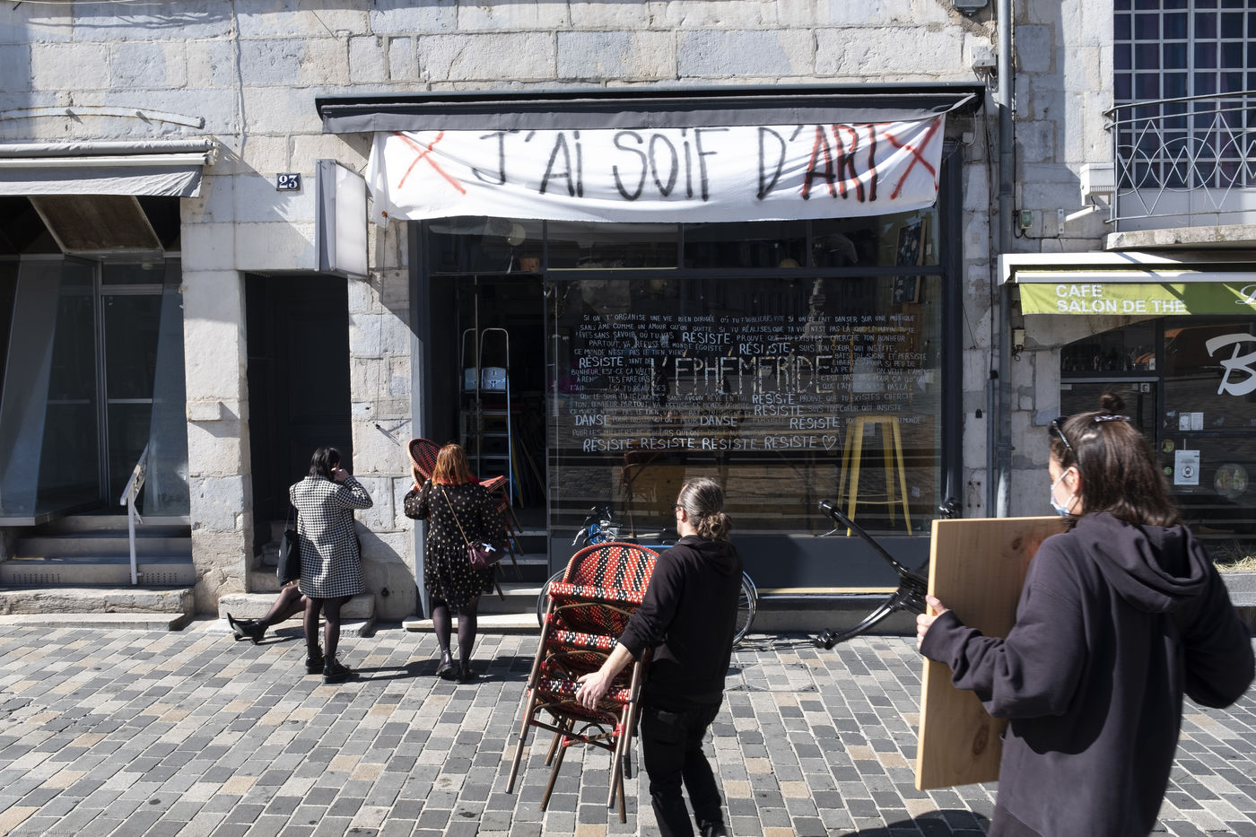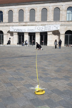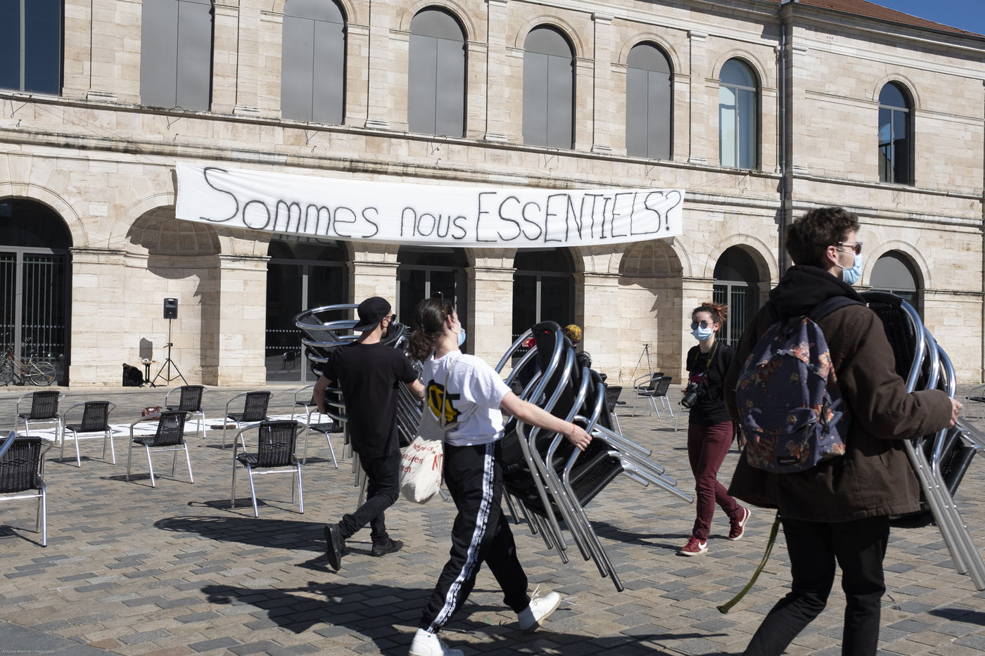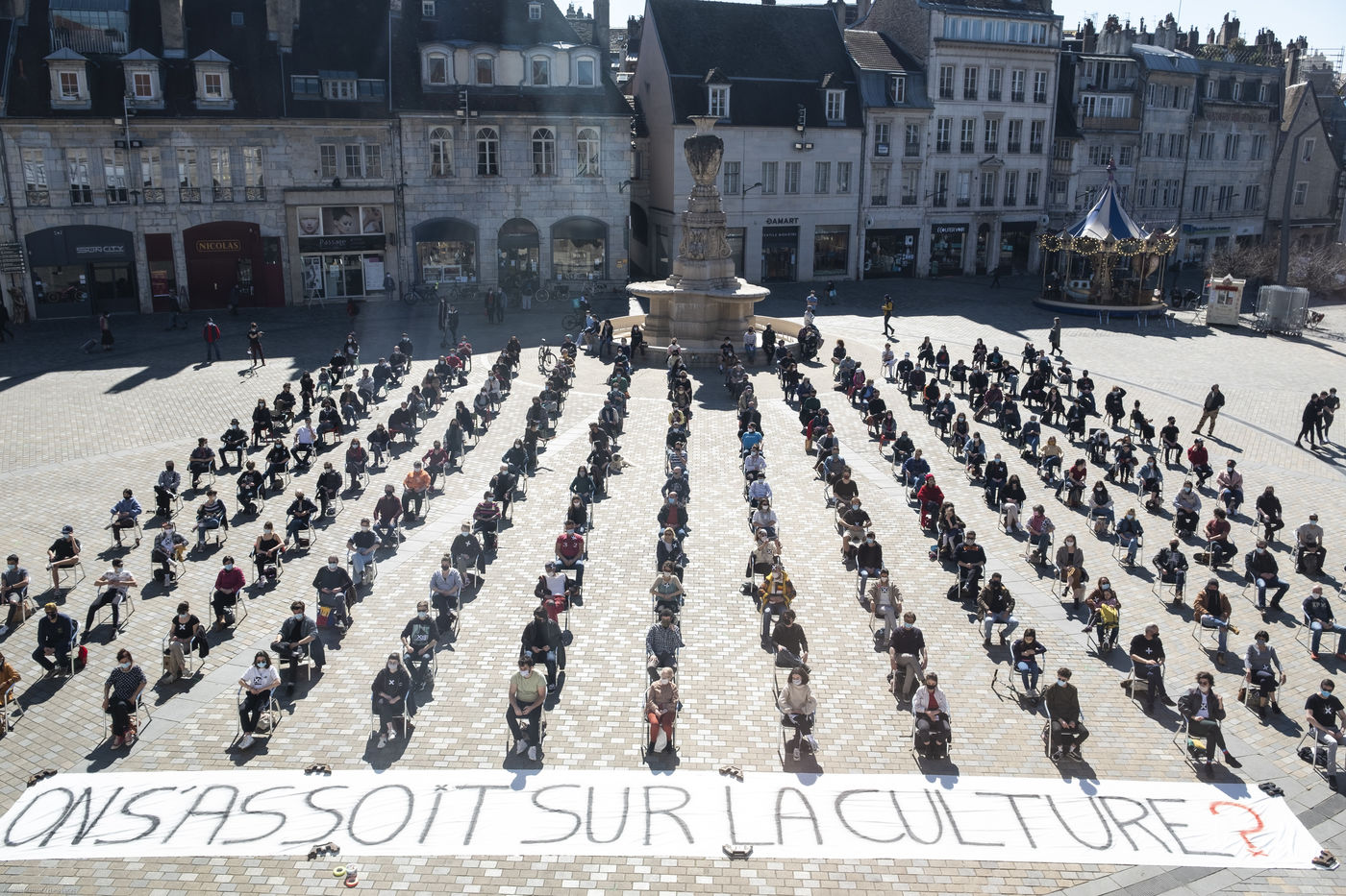 Every day at 2pm an agora is held in front of the theatre. Multiple actions have already taken place. After the installation of numerous banners throughout the city, a large festive and protest rally on 21 March at the Cité des Arts, the CIP FC (Coordination de Intermittents et Précaires de Franche Comté), the DNMADE section of the Pasteur high school and the CGT spectacle organised a flash action at the Place de la Révolution.