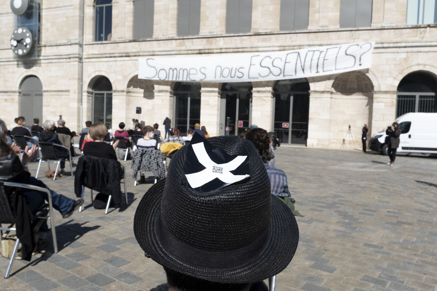The participants remained seated for about fifteen minutes, the time for the organisers to obtain images, to put the future restrictions into practice, and to reflect the impossibility for them to evolve under these restrictions.
