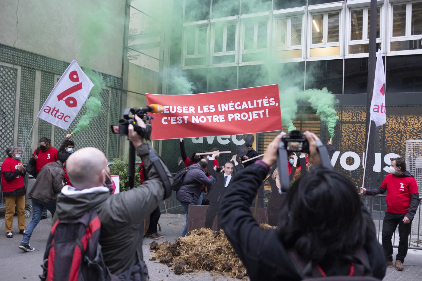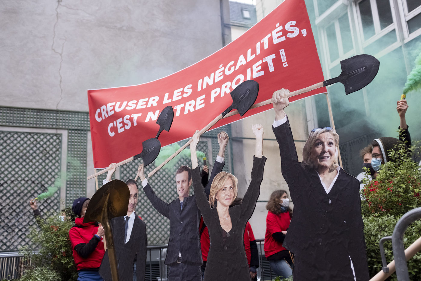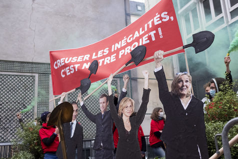 IIn front of the LREM headquarters, rue rocher in the 8th arrondissement, activists of the Attac association organised a lightning action in the framework of the release of their new report "The candidates of inequalities", taking up the socio-economic proposals of the candidates of the right and extreme right.