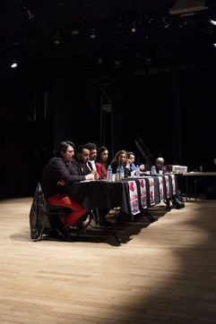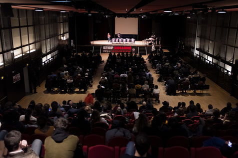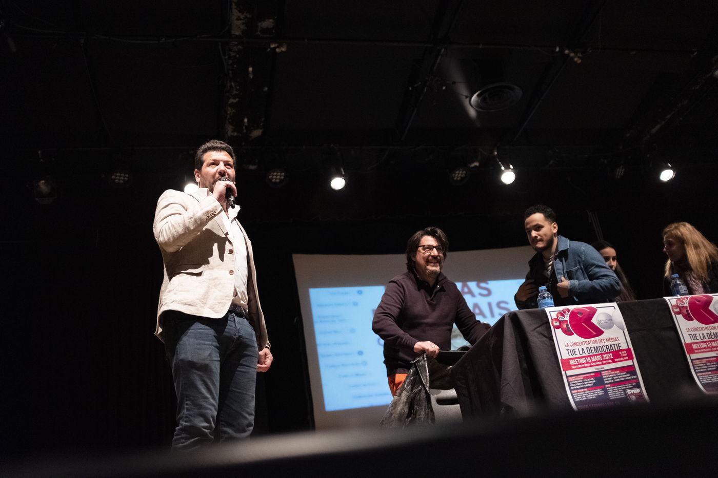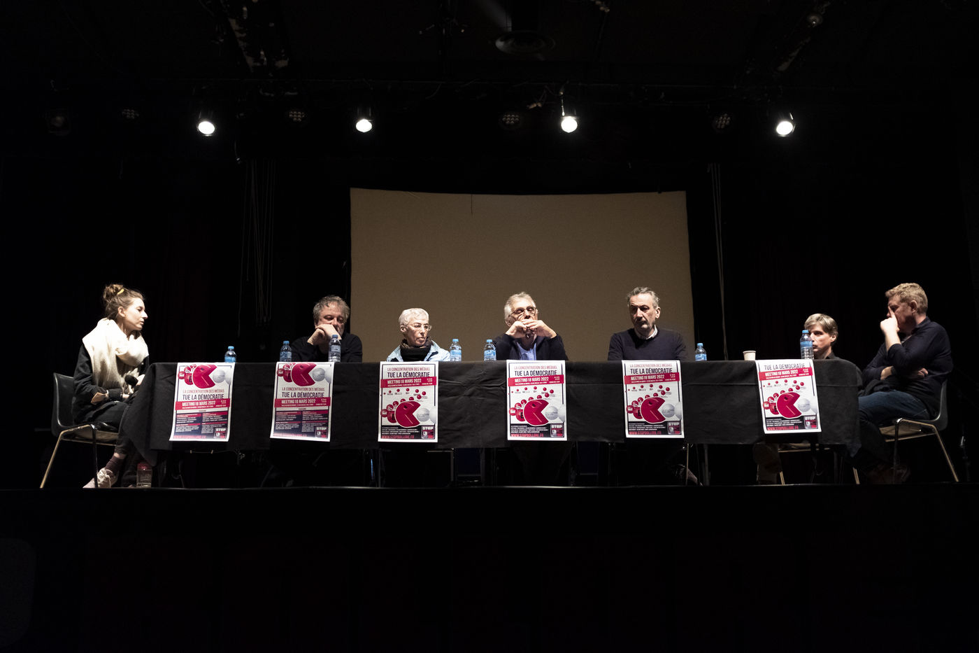 La première autour de Lucile Berland, Denis Robert, Marion Mazauric, Daniel Schneidermann, Sylvain Bourmeau, Nicolas Vescovacci, Jean-Baptiste Rivoire.