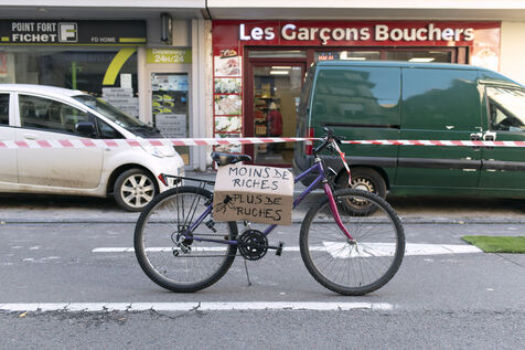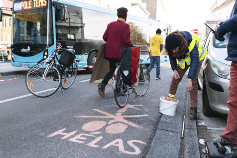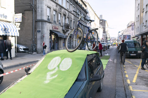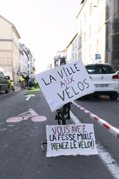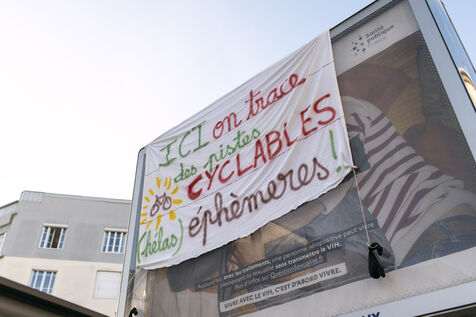 The aim of this media action was to denounce the lack of infrastructure allowing cyclists to travel safely on certain roads in the city and to alert people to the urgent need to change our modes of transport in order to reduce greenhouse gas emissions.