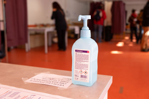Le premier tour des élections municipales a lieu pendant l'épidémie de coronavirus. Gants, masques et gel hydroalcoolique sont la particularité de ces elections. Il n'est pas facile d'obliger les gens à garder leurs distances de sécurite. Toulouse, 15 mars 2020.