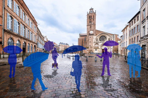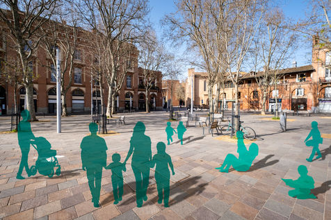 Toulouse at the time of confinement following the coronavirus pandemic which affected the majority of countries. Deserted streets in the middle of the day. An everyday animation that has disappeared. In the manner of architects who inlay people on 3D perspectives in order to obtain a rendering closer to real life, I wanted to give back to the city its lost dynamism by inlaying silhouettes of people, who are not quite present.