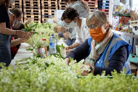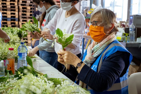 Secours Populaire de Toulouse received lily from the valley from producer Maud Thierry, following a donation campaign launched on the internet (muguet solidarite). A whole team of volunteers is busy preparing more than 3,000 bouquets, which will be handed over to the retirement homes the next day, both for residents and nursing staff. A burst of generosity in the midst of a coronavirus epidemic. Toulouse, April 29, 2020.