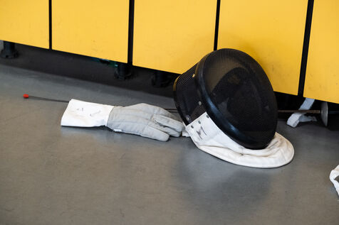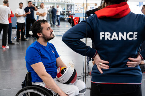 Portrait of Maxime Valet, disabled fencer in a wheelchair. Rio 2016 and Tokyo 2020 medalist, he is preparing for the Paris 2024 Paralympic Games. That day, he trains with his master-at-arms while raising awareness about disabled sports for sports educators.