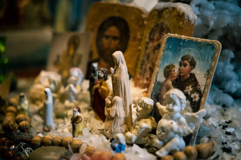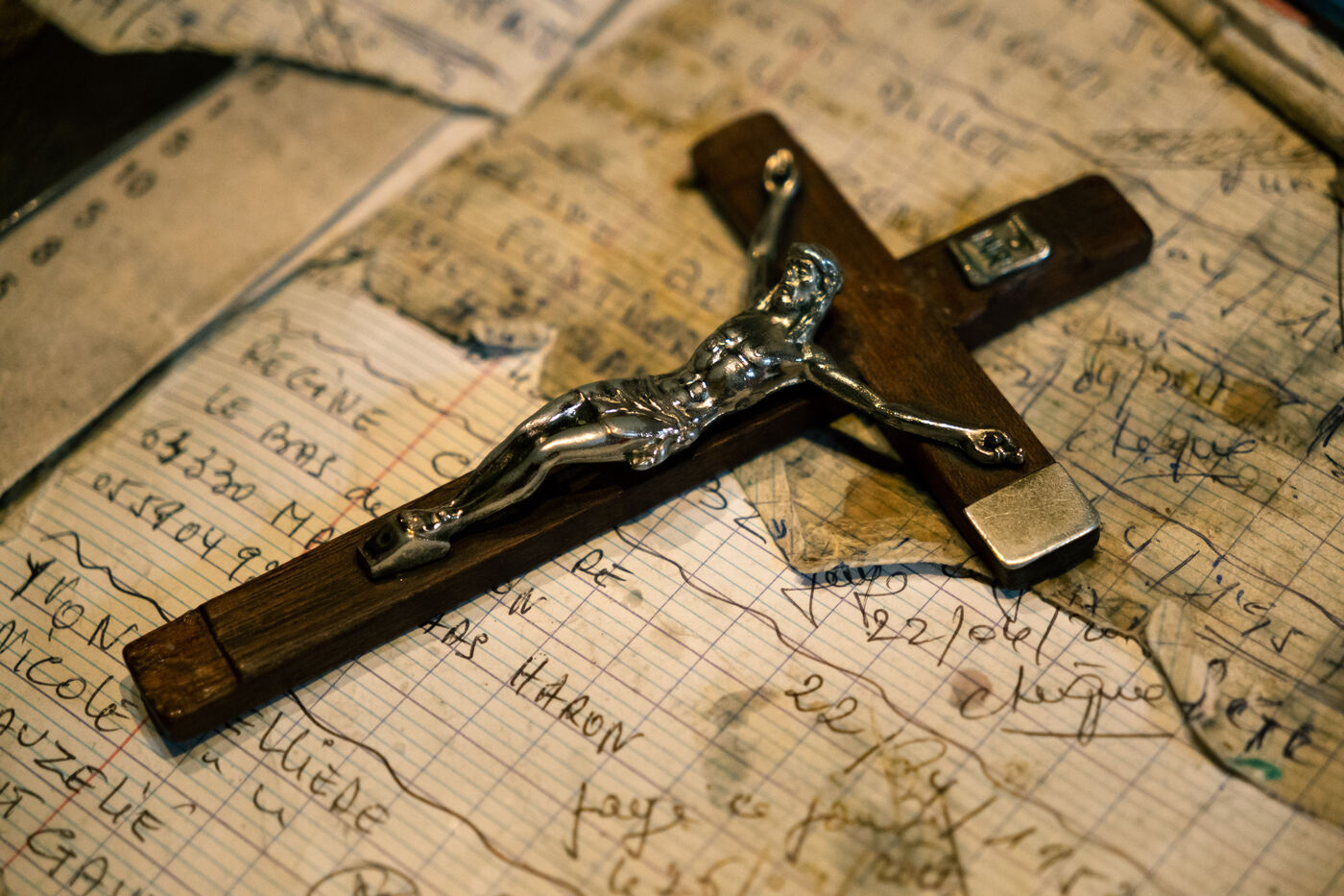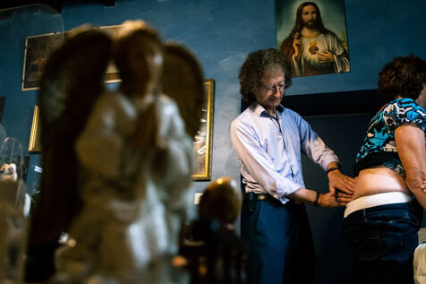 Portrait of Pierre Dulong, mayor of the village of Ligardes but also exorcist and healer, in his consulting room filled with holy icons, statues, figurines, books. The queue is long to be able to consult him for health problems or spiritual problems.