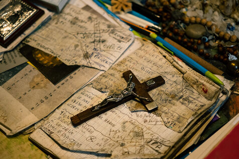 Portrait de Pierre Dulong, maire du village de Ligardes mais aussi exorciste et guérisseur, dans son cabinet de consultation rempli d'icones saintes, de statues, de santons, de livres. La file d'attente est longue pour pouvoir le consulter pour des problèmes de santé ou des problèmes spirituels.
