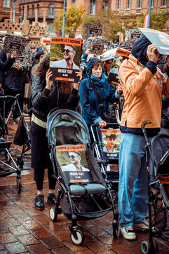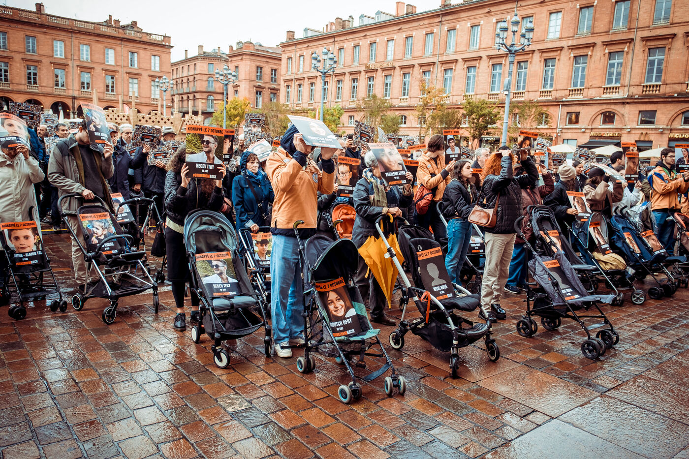 At the call of the CRIF, 200 people, mainly the Jewish community of Toulouse, gathered on the Place du Capitole in support of the Israeli hostages held by Hamas. Empty strollers in the front row denounce the fact of holding children hostage.