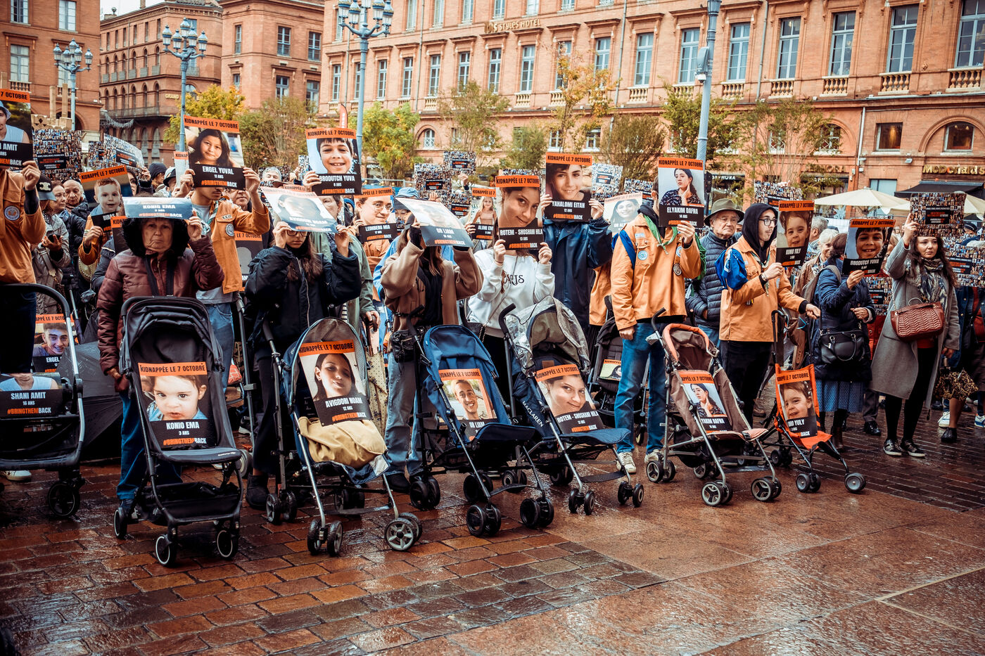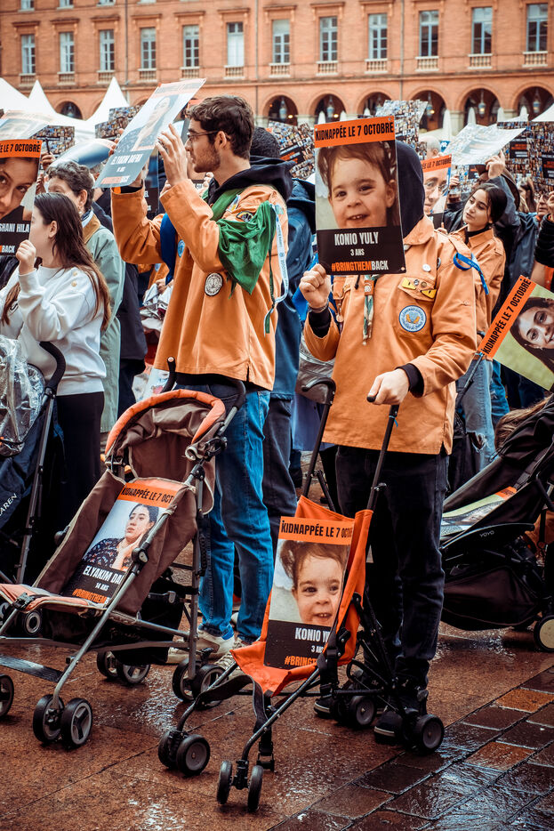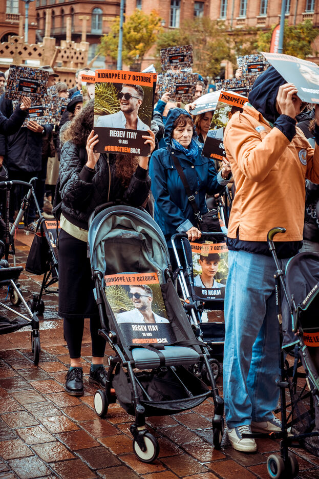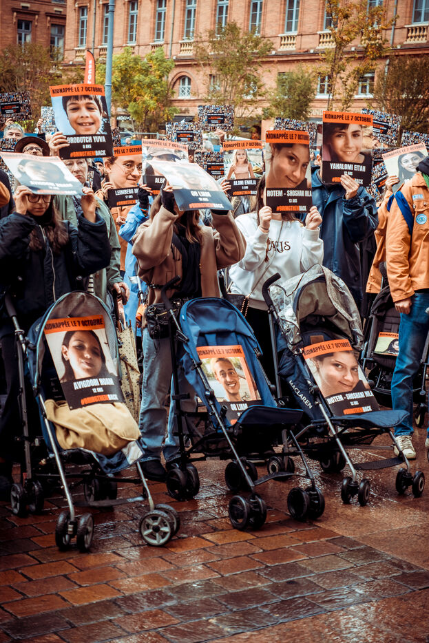 A l'appel du CRIF, 200 personnes, principalement la communauté juive de Toulouse, se sont rassemblées sur la place du Capitole en soutien aux otages israeliens retenus par le Hamas. Des poussettes vides au premier rang dénoncent le fait de retenir des enfants en otages.
