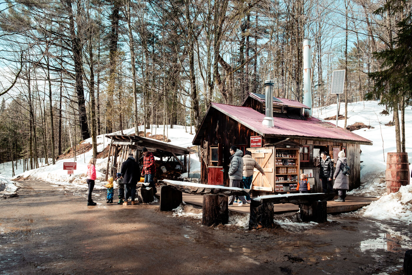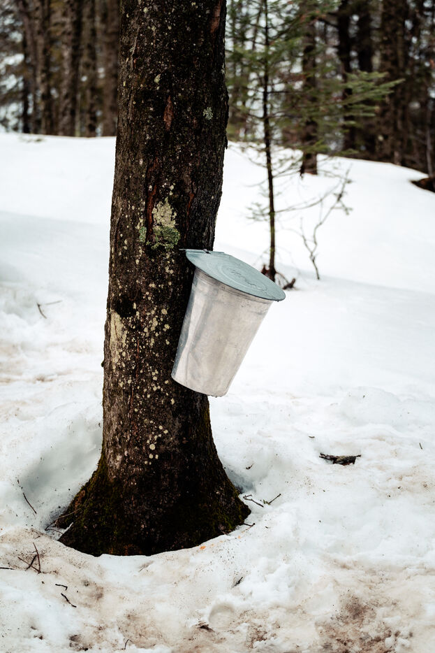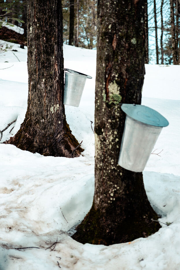 The sugar season begins when daytime temperatures are above zero degrees Celsius while remaining below freezing at night, it lasts between 4 and 6 weeks in spring. At this time, the sugar shacks are busy transforming the maple sap collected via a system of tubing into maple syrup. The water passes through an evaporator to concentrate the sugar; it takes on average 40 liters of water to make one liter of maple syrup.