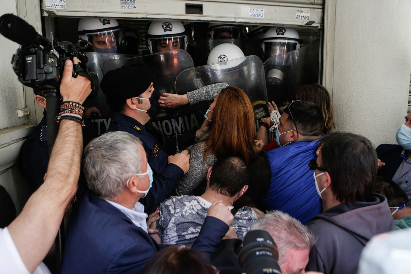 Health workers at public hospitals try to push their way through the entrance of the Ministry of Health in Athens in order to see the Minister of Heath, Vasilis Kikilias, during a rally. Health workers have been striking today to show their dissatisfaction with the handling, by the government, of the covid-19 pandemic.