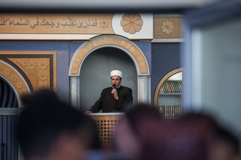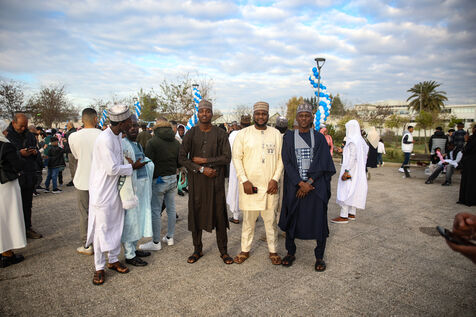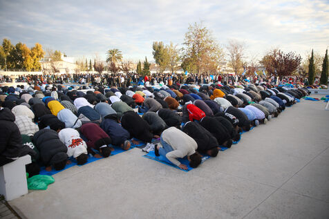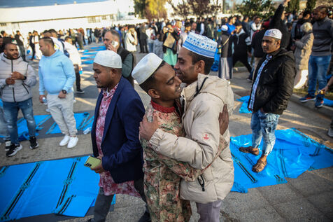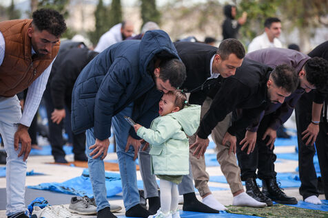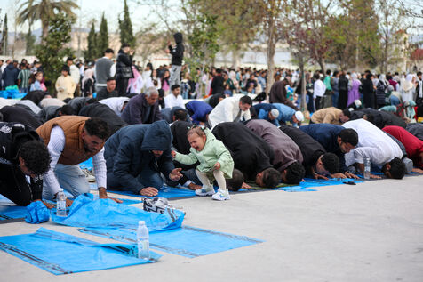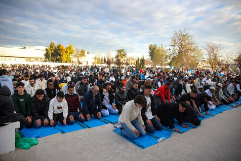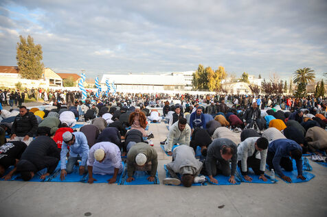Les musulmans prient pendant la celebration de l Aïd al-Fitr, marquant la fin du jeûne d'un mois du Ramadan, de l'aube au coucher du soleil, pour l'une des plus grandes fêtes du calendrier islamique, à la mosquée Centrale d'Athènes, à Votanikos le 30 Mars 2025
