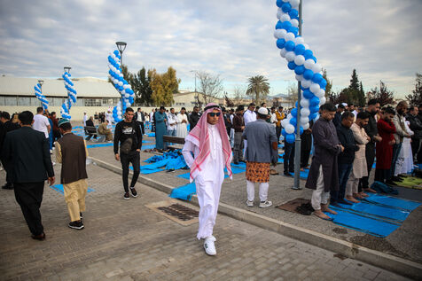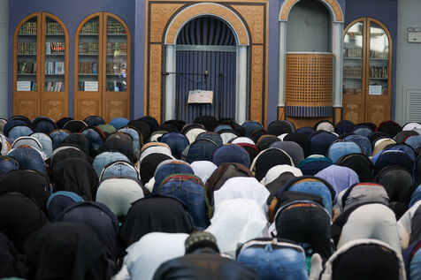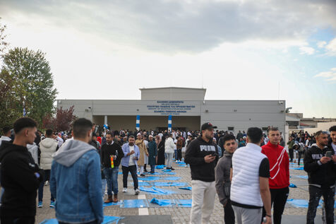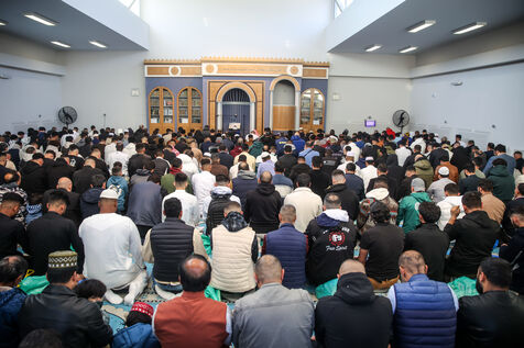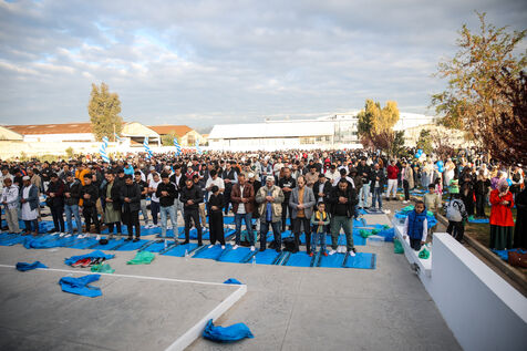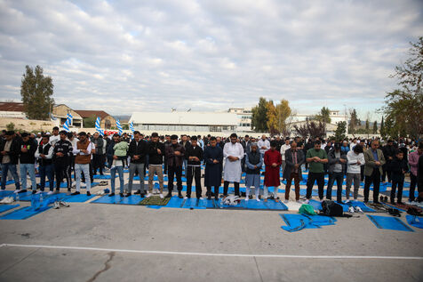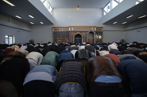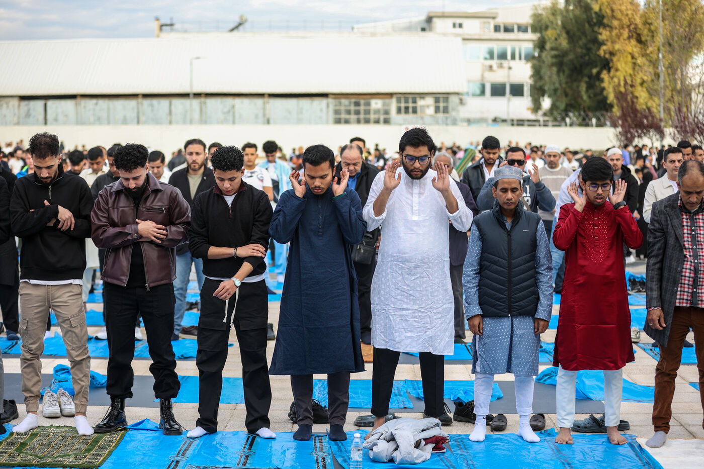 Muslims pray during the celebration of Eid al-Fitr, marking the end of the month-long dawn-to-sunset fasting of Ramadan for one of the biggest festivals of the Islamic calendar, at the Central Mosque of Athens, in Votanikos on March 30 2025.
