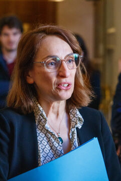 Les députés rapporteurs Violette Spillebout et Paul Vannier, ainsi que la présidente de commission Fatiha Keloua-Hachi, avant leur table ronde reunissant des représentants de collectifs de victimes, cycle d'auditions dans le cadre de l'enquête sur les modalités du contrôle par l'Etat et de la prévention des violences dans les établissements scolaires, députés de la commission d'enquête de la Commission des affaires culturelles et de l'éducation dans la salle Lamantine de l'Assemblée Nationale à Paris, France le 20 mars 2025.