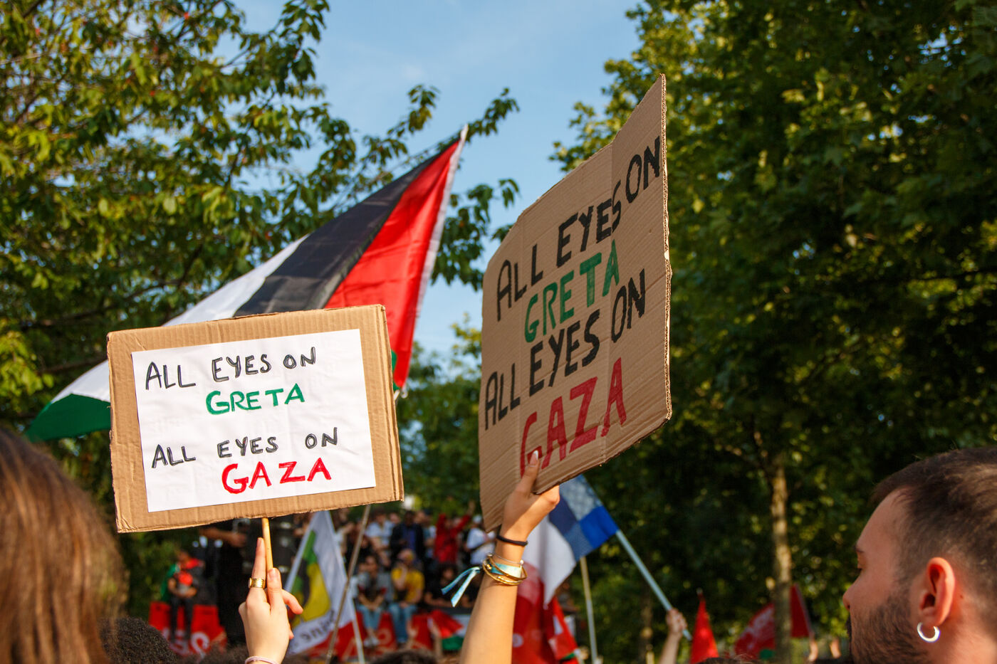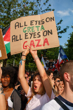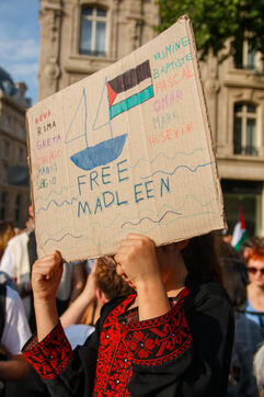 Demonstration following the arrest of the Madleen humanitarian boat, and in support of the people of Gaza, against the ongoing genocide and for an immediate ceasefire, Place de la République, in Paris, France on June 9, 2025.